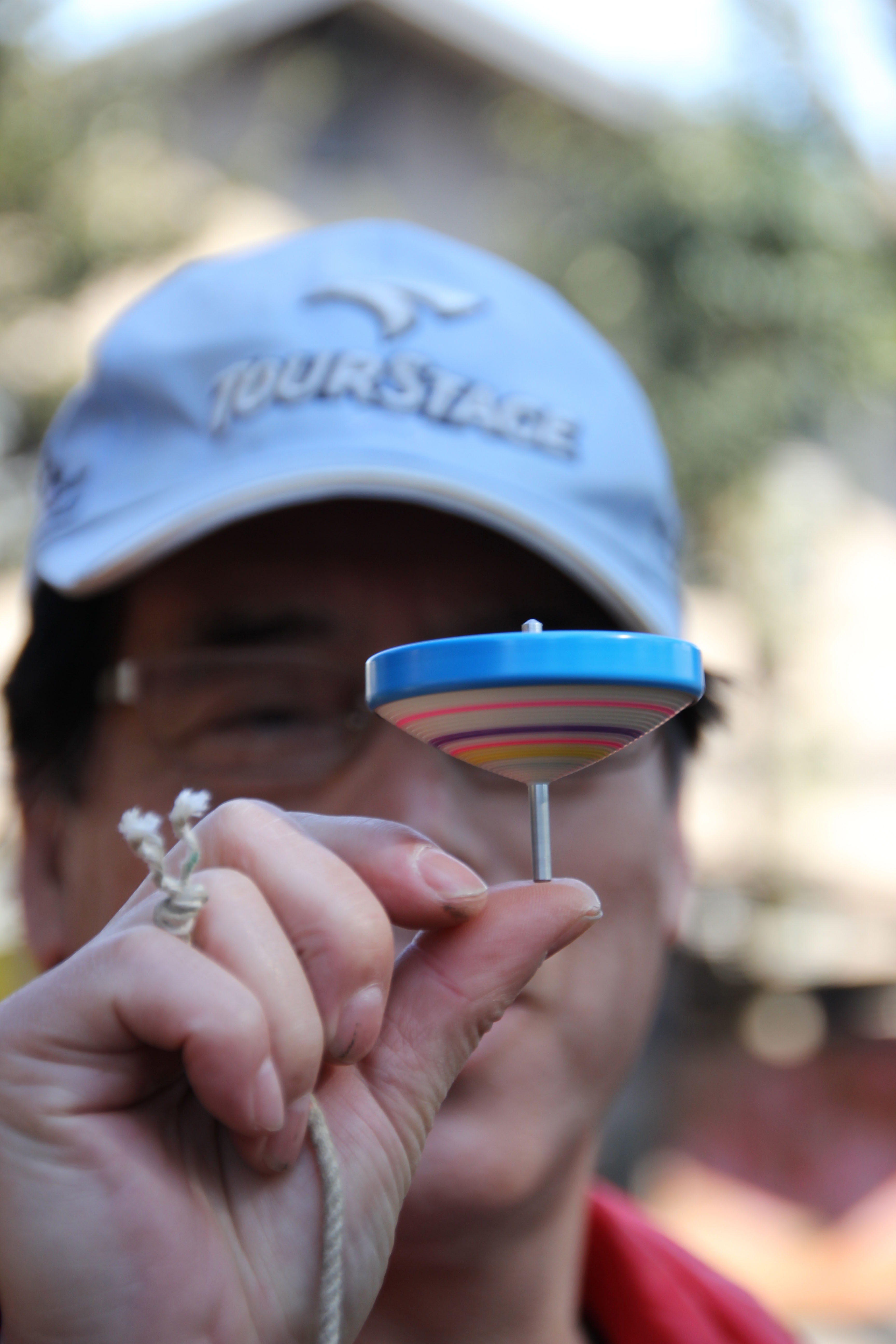 Takeo Shigehara, 65, another park regular, is a master at controlling koma (spinning tops). Equally adept at beigoma (small metal tops), Takeo patiently tries to teach me the skill. "I've been doing this since age 5," he says, setting one top spinning on his palm. "Well, I mean I worked a real job, too," he adds quickly, "but I've always been into tops."