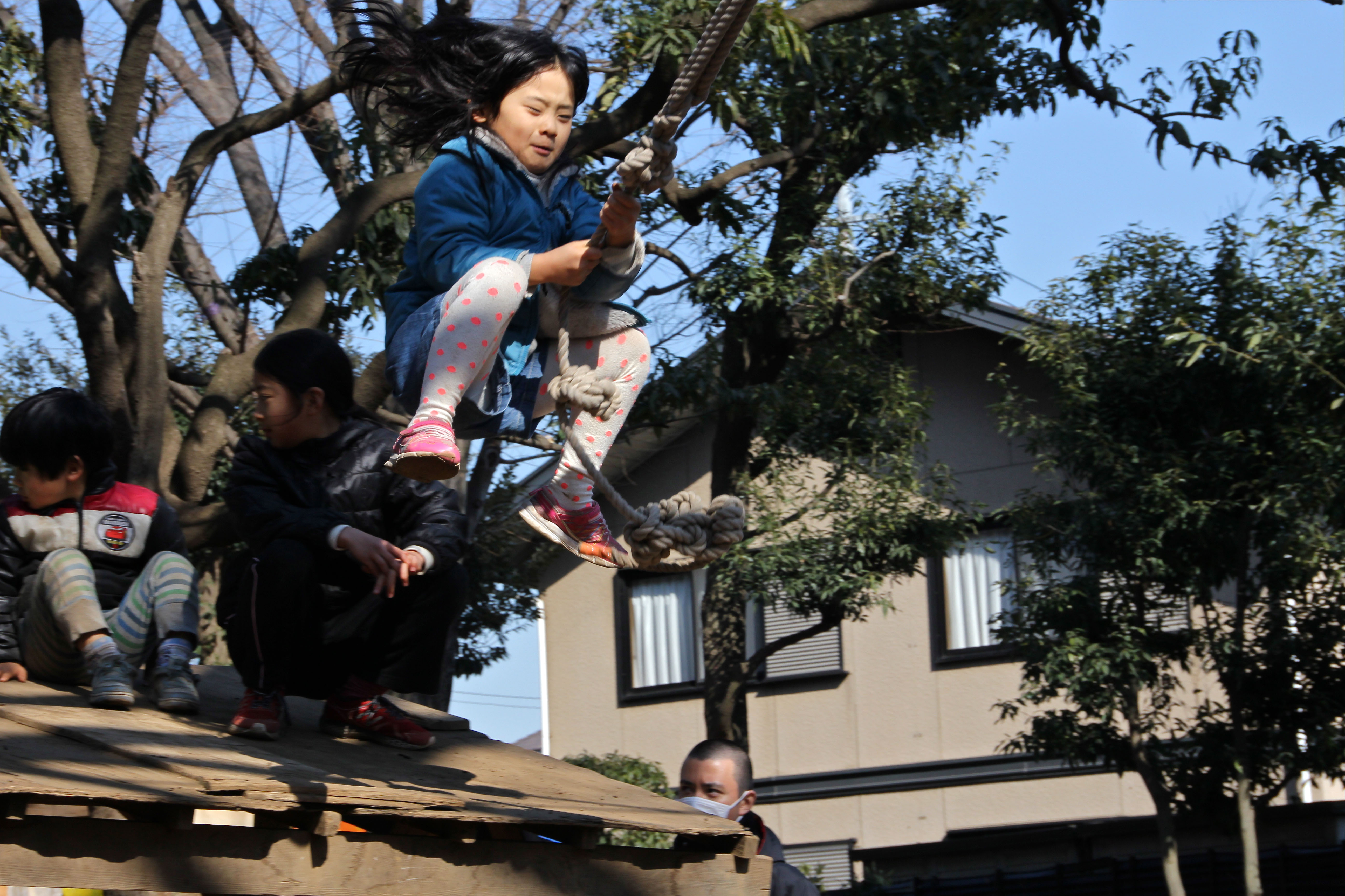Done hammering, Haruko pulls me towards her favorite part of the park — the Tarzan Swing. Here, kids perch on the roof of a shed, grab a rope, and go flying over the heads of the other children. "It's scary at first," Haruko admits, but in the next breath she's air borne and laughing.