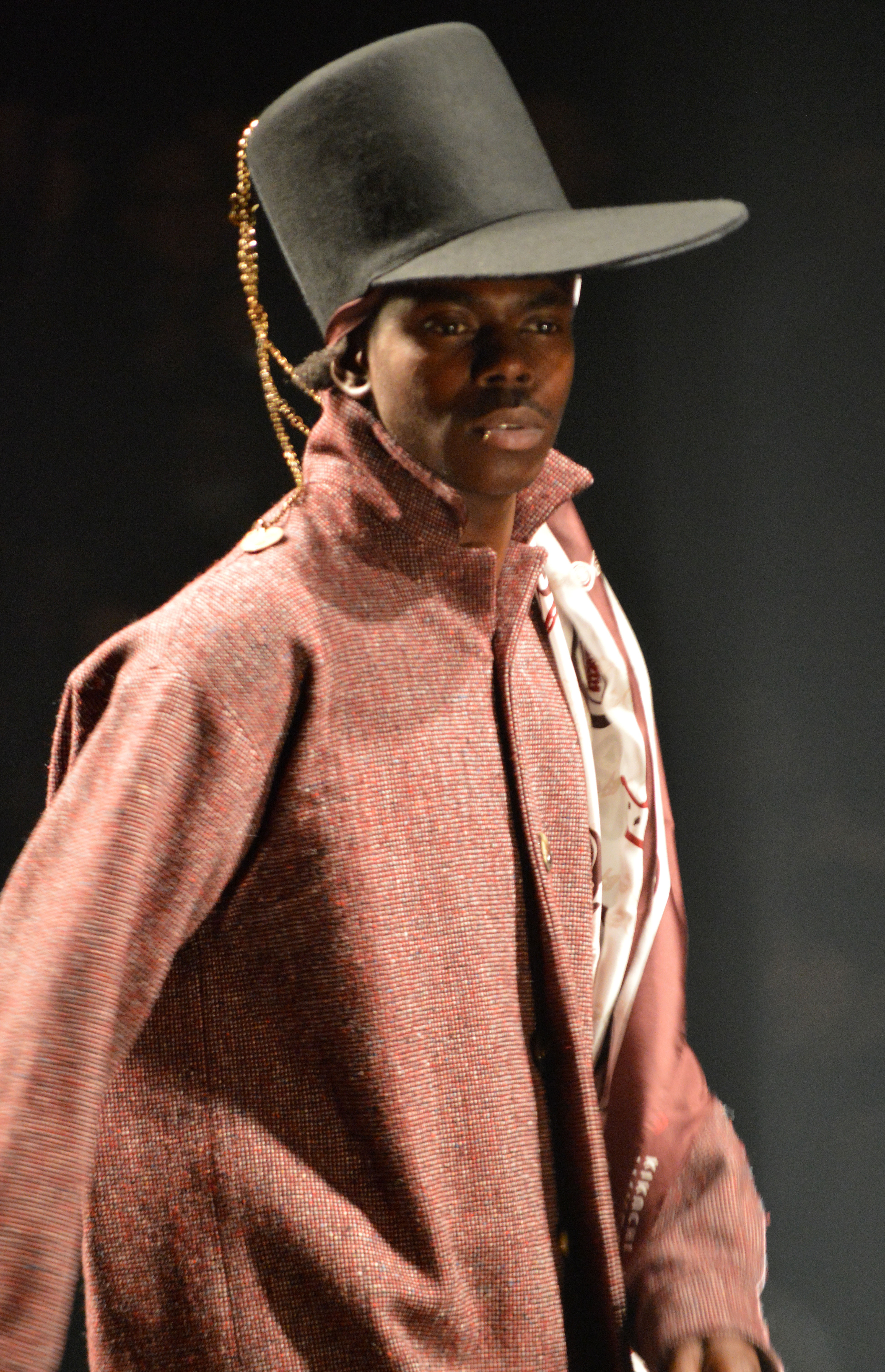 Proposing alternatives to the status quo, Jotaro Saito offered street-savvy takes on the male kimono, breaking with tradition so far as to render the garment in denim, paired with a hooded sweatshirt and gym bag.