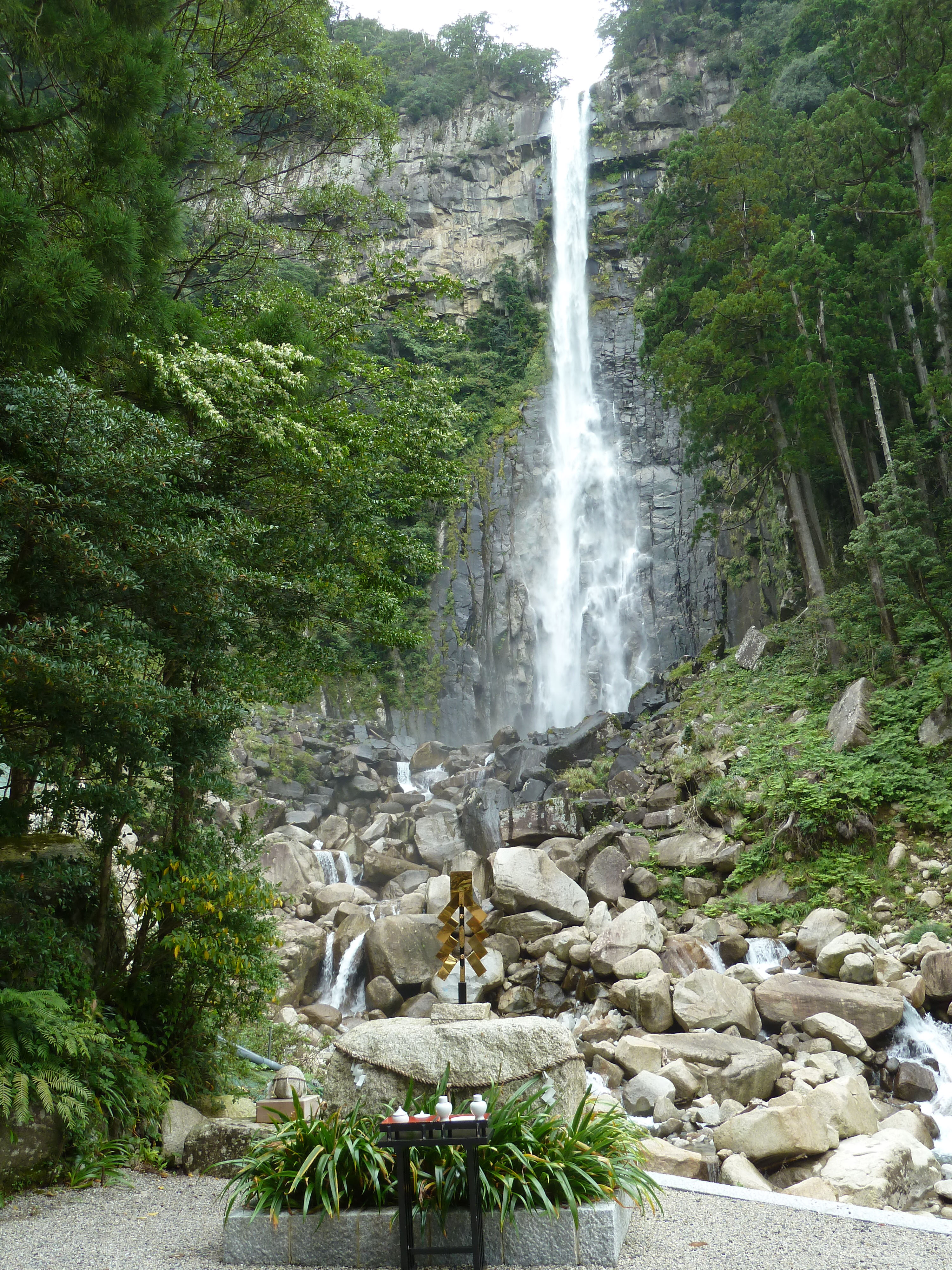 My fellow lecturers and I take a bus along the coast to Nachi, then another that winds up the mountain to the base of Daimon-zaka, a long stairway of rough stone steps that leads to the torii gate of Kumano Nachi Taisha. Set into the mountainside is the shrine itself, a cluster of thatched red-painted buildings, with a museum and an atmospheric old temple of faded wood. We climb the three-story pagoda and clamber down through the trees to Nachi Falls. It's wonderful to be walking through the empty wooded mountains, hearing the trickle of water and the shrill of cicadas echoing up the valley.