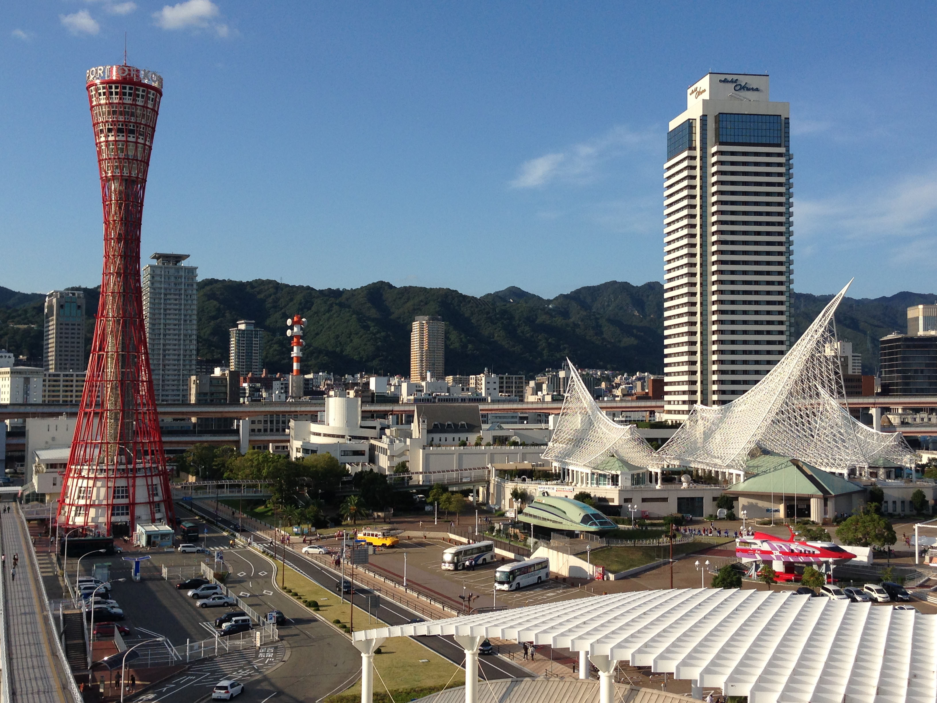 That evening we sail for Kobe in Hyogo Prefecture. I'm up early to watch the sun rise over the ocean and the distant coast. Kobe, too, presents a different face to the sea. The quay is dominated by the Kobe Meriken Park Oriental Hotel, which curves, gleaming white, like the prow of a ship with tiered balconies like decks — the mirror image of our own ship. One of the buildings sports an elegant roof curving like fishing nets. By night neon glitters, the nets light up and the Ferris wheel turns. It's a spectacular sight.