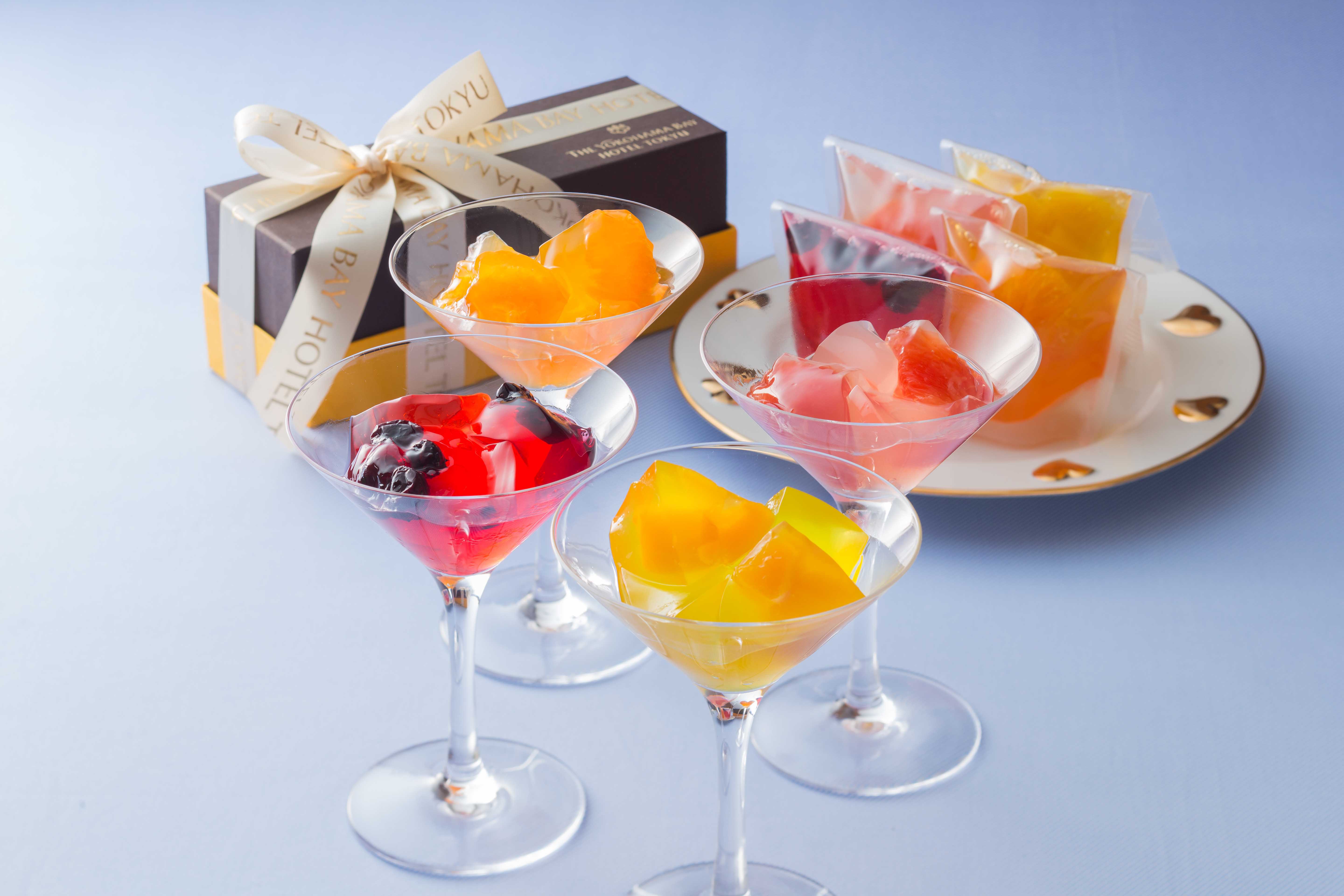 At the pastry corner of Somer House, a lounge on the second floor, an assortment of four different kinds of gelee au fruit (fruit gelatin) is being offered for ¥1,200 (tax included), with pink grapefruit, orange, acerola and berry, and passion fruit and mango flavors available.