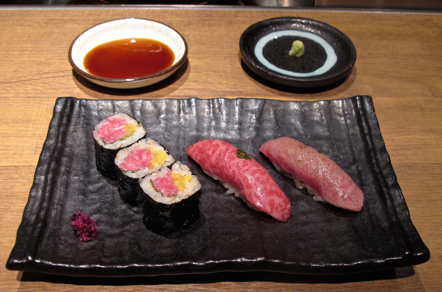 If you still have room in your stomach there is one final highlight: wagyu sushi. Strips of beef as rich as the belly-meat of bluefin tuna are pressed onto rice flavored with ginger rather than vinegar, and served with a few maki (rolled) sushi.