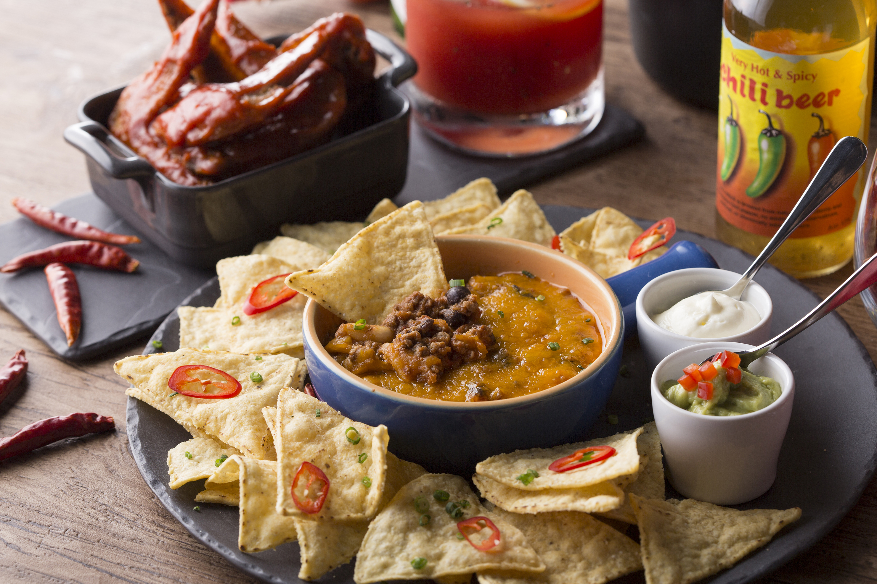 Hot sangria, shochu distilled spirits with hot water, chili beer with red pepper, and hot Kahlua and milk are included in the all-you-can-drink plan for ¥3,500 per person, in addition to regular drinks such as draft beer and red and white wine. Other items such as spicy Buffalo wings and chili with cheese are available from ¥500.