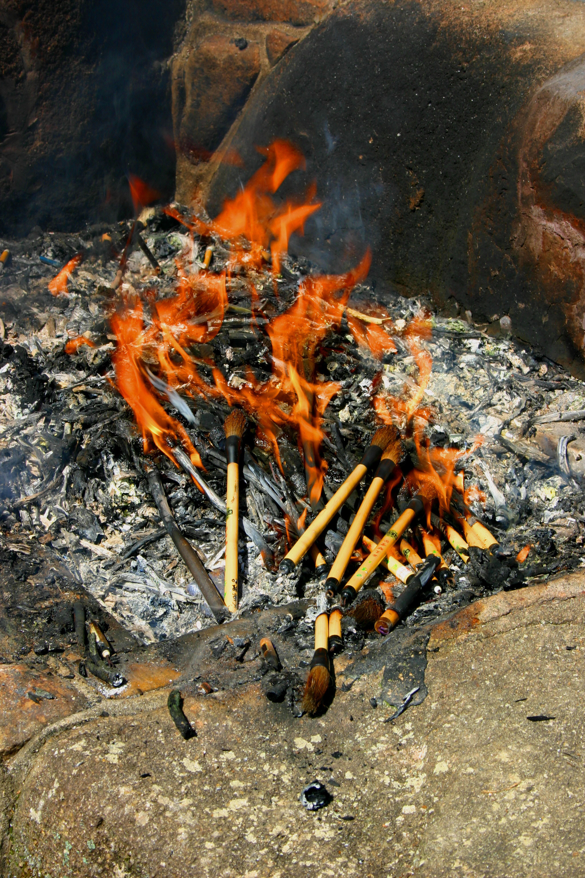 In the soft morning drizzle, a handful of people line up before an altar-like mound of stones where a small fire crackles and hisses. Each person in turn throws a handful of old brushes into the blaze. The local garbage incinerator? No — this is ritual cremation.