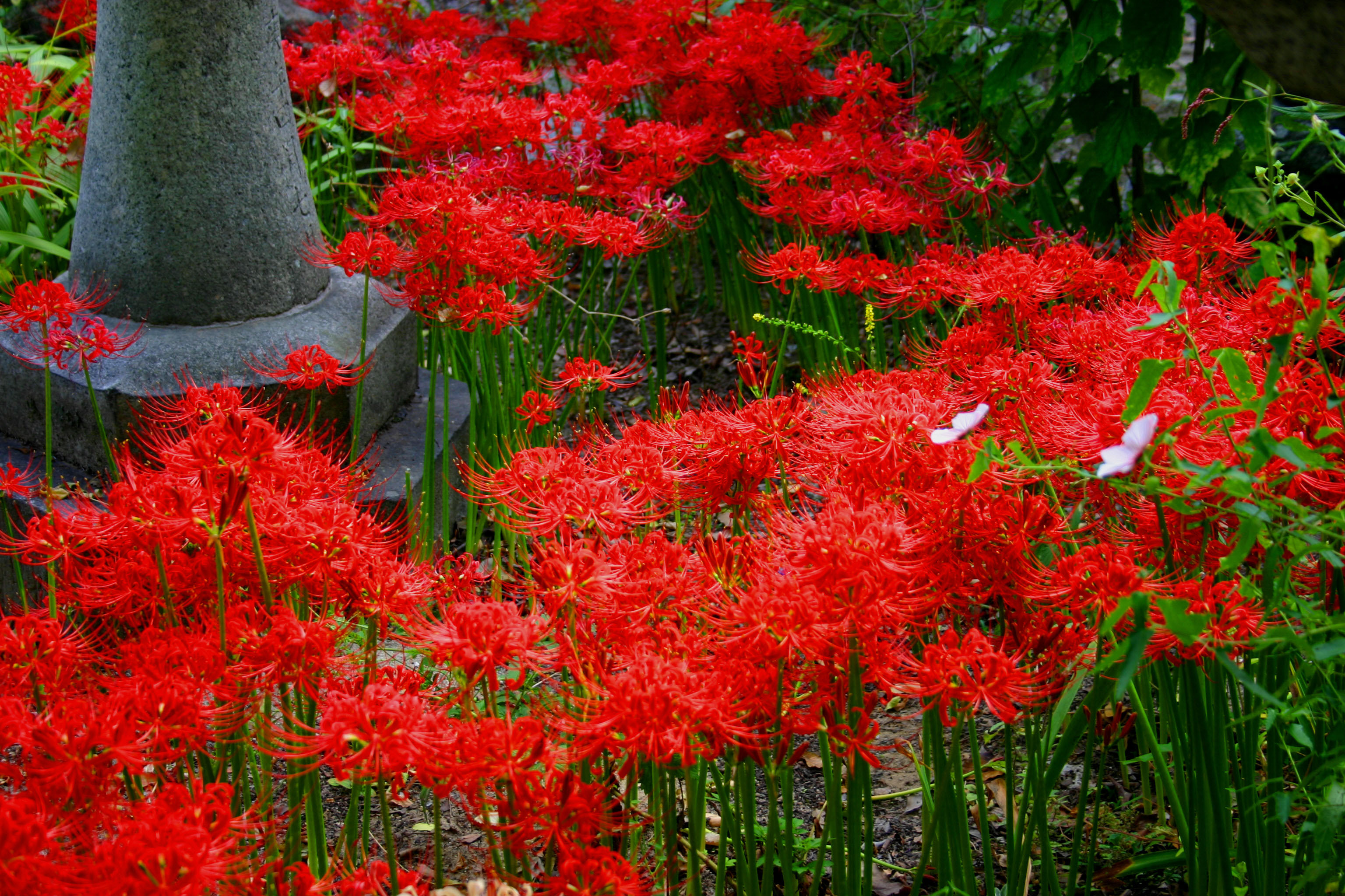 We head back down to the broad esplanade below the shrine, where clusters of brilliant red higan bana (literally equinox flowers, better known as spider lilies) are "fluttering and dancing in the breeze," as the poet William Wordsworth said of his daffodils.