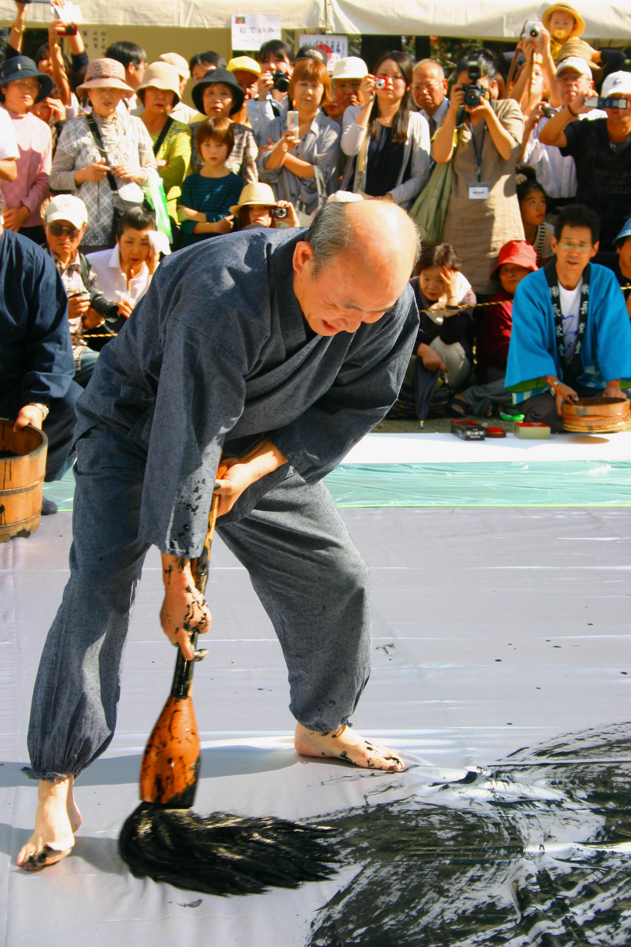 A large crowd gathers for the festival's high spot: a demonstration by a master calligrapher. Like a Japanese Jackson Pollock, the master paces barefoot around his "canvas" (a large vinyl sheet spread on the ground) in a balletic whirl, wielding a heavy brush longer than his arm. His assistant stands by with an ink-pot, big as a barrel. In large graceful strokes, the master composes his message.