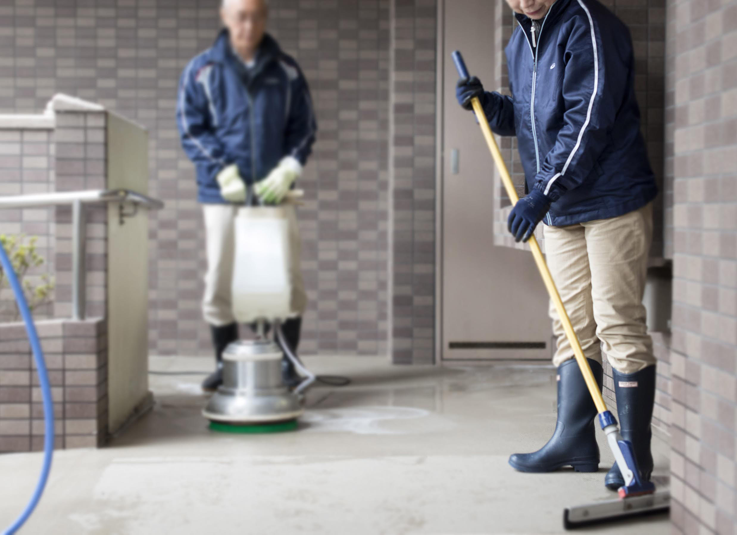 They unload mops and brushes, roll out the hoses, and plug in the industrial polisher and fan as they go about their work cleaning each floor of the building, forgoing the use of elevators in favor of the stairs as a courtesy to residents.