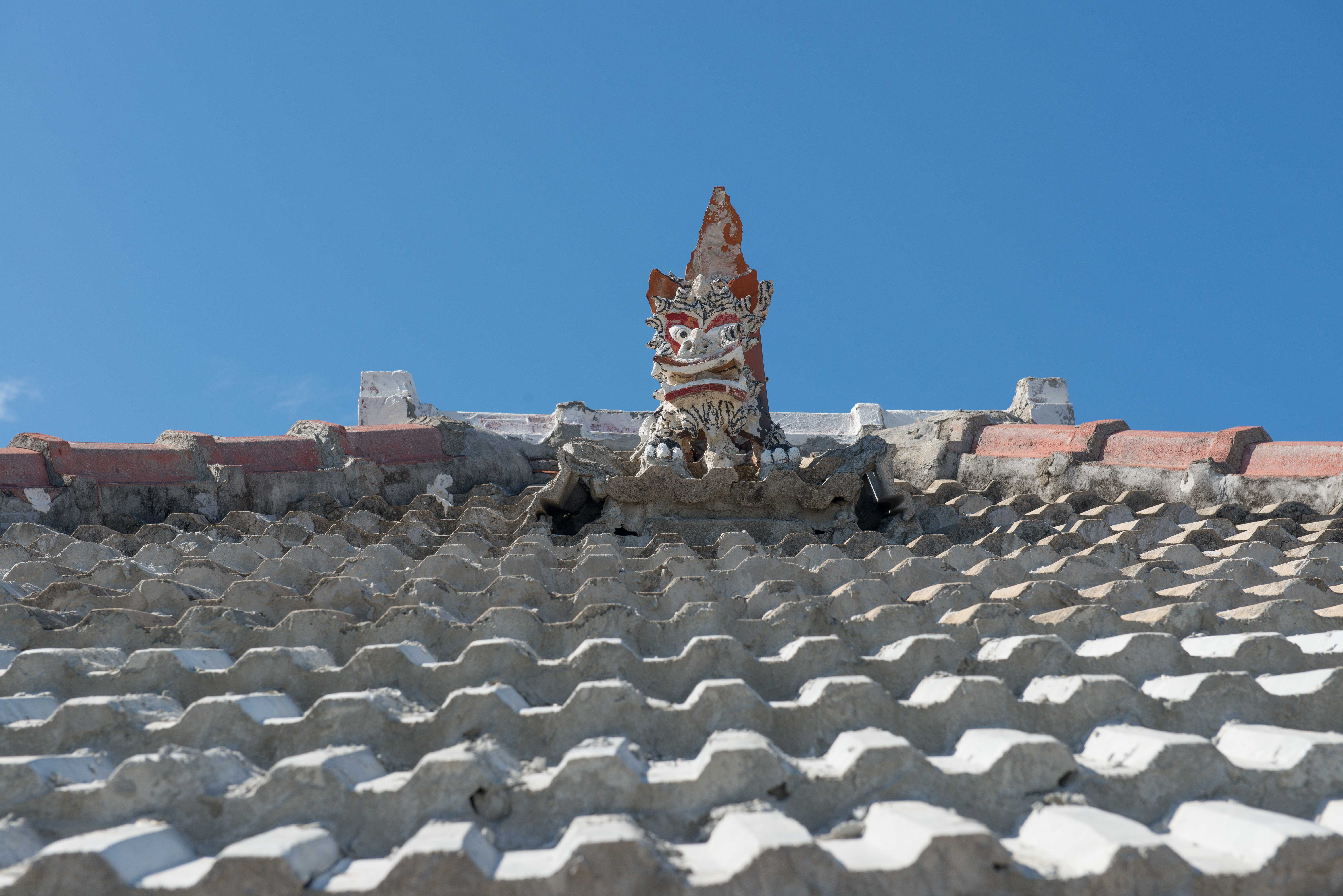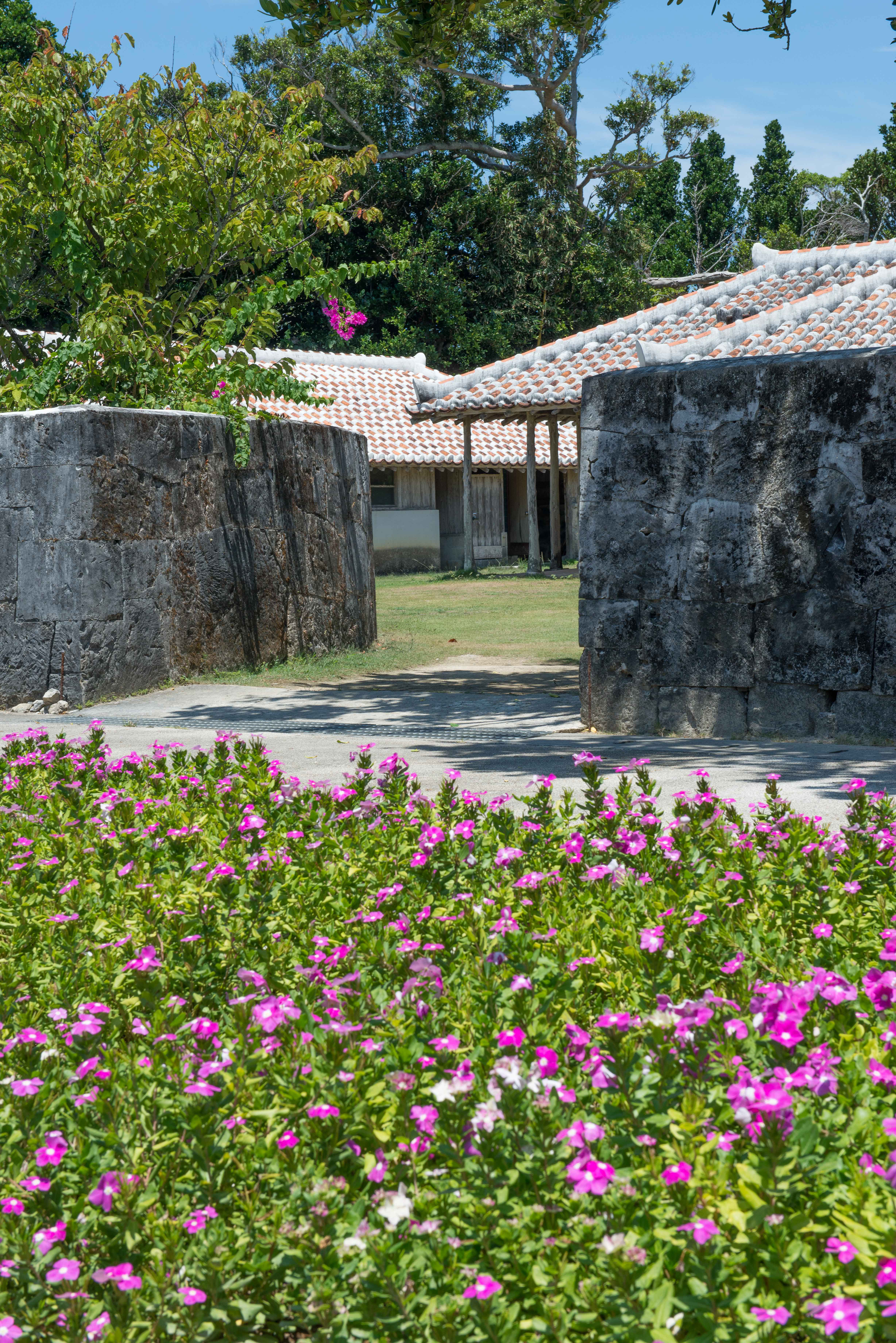 The gardens and houses on this island were larger than elsewhere, village residencies conforming to traditional design lines, with wooden paneled walls, beams and exposed posts; roofs of ceramic tile sealed with mortar; airy decks; and rooftops graced by protective shīsa, the Okinawan lion dog. The dry stonewalls lining lanes and acting as property borders, were typically made of coral, but darkened by age.