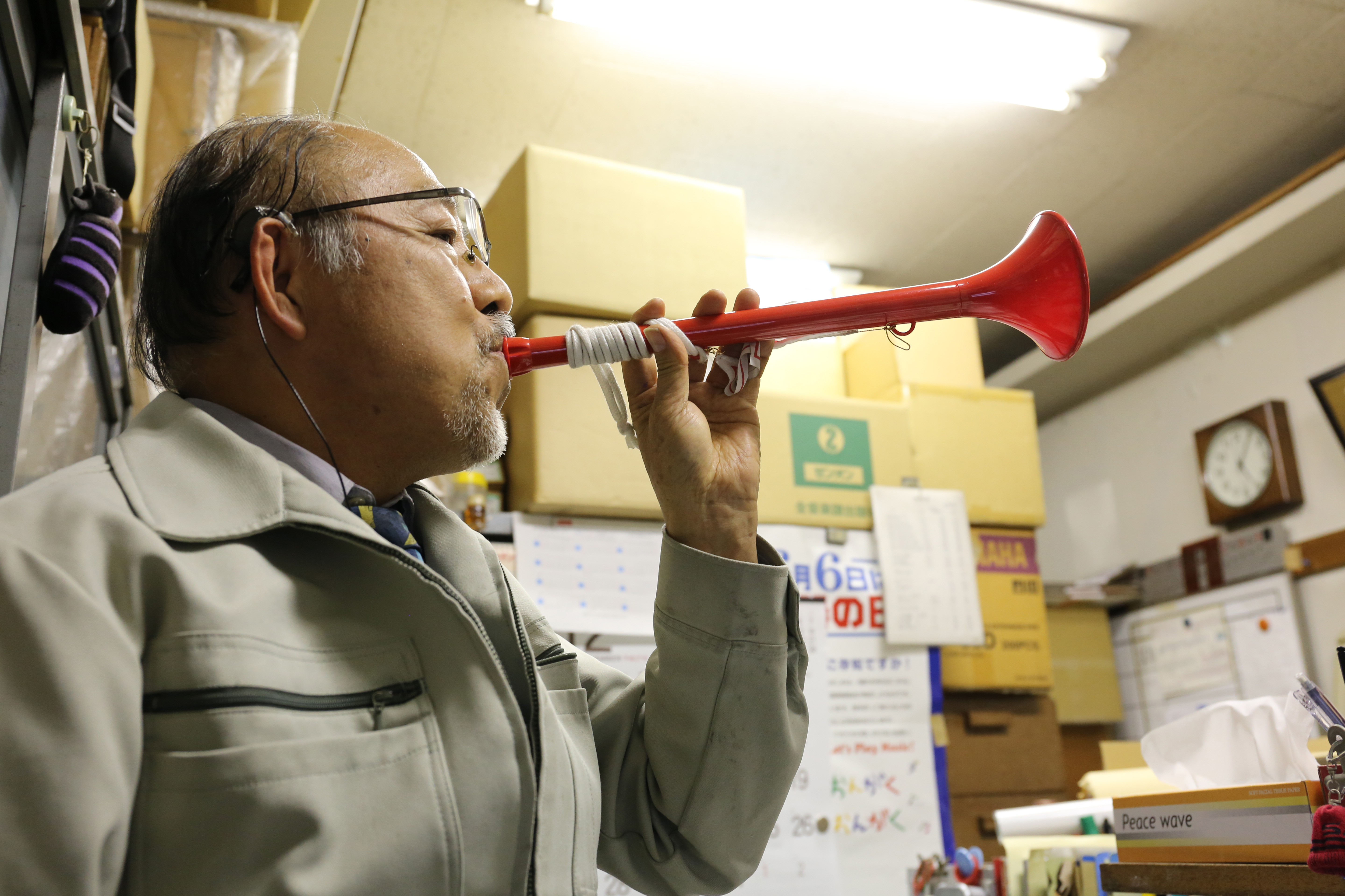 You'd never guess that from the enthusiasm Hasegawa brings to the job. He's proud of the engineering and harmonica reeds of his plastic horns. "They make an actually pleasant sound, unlike cheap versions from overseas," he says.