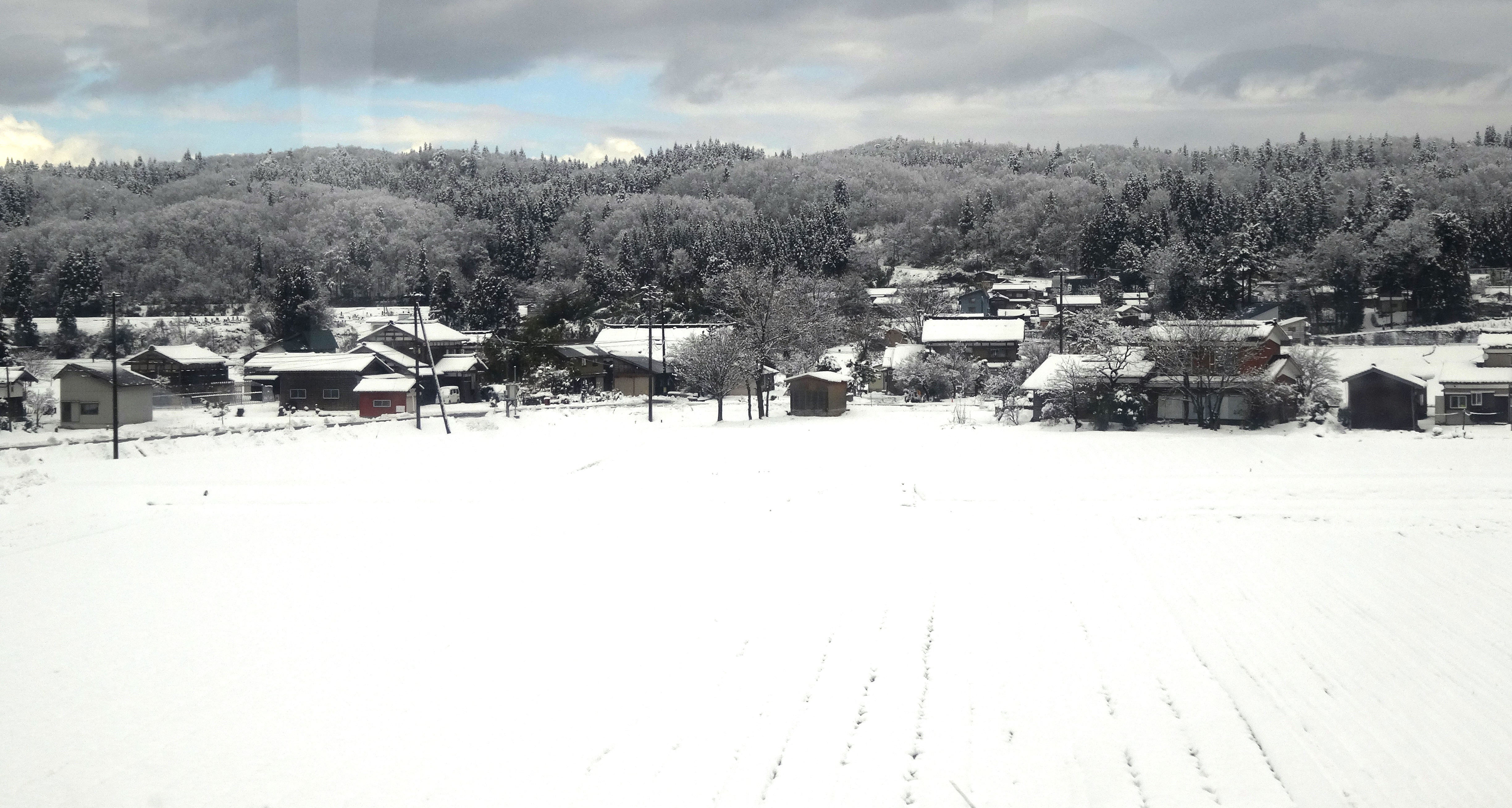 Marred though the view is with power lines and other trappings of modernity, the rainbow that appears at the far end of Tsubame-Sanjo Station seems a rather auspicious beginning. The initial impression that greeted us in front of this largely unpopular station just south of Niigata on the Joetsu Shinkansen line was a panorama of patchy snow, dirtied by tires and car exhaust, pounded down with a light layer of hail. As the clouds break and the multicolor mirage appears, however, I begin to feel slightly optimistic about our escape to snow country.