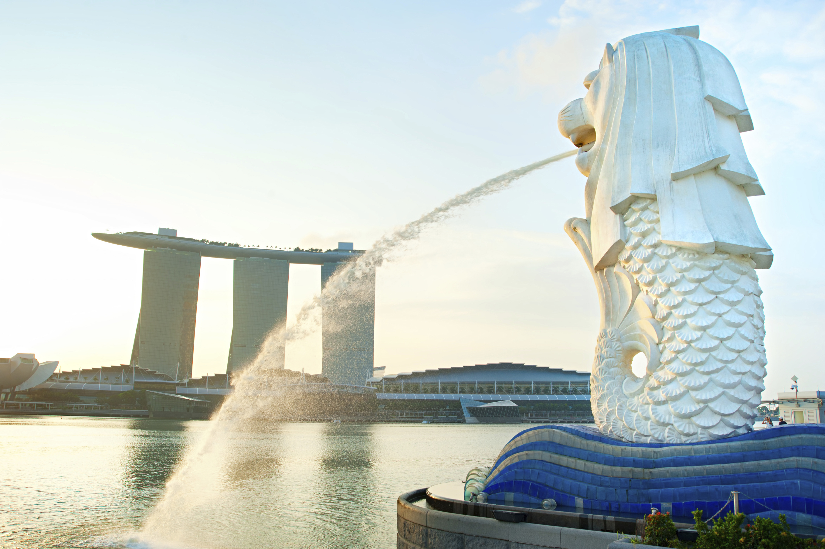 The Merlion fountain spouts water in front of the Marina Bay Sands Hotel. The Merlion is a fictional creature with the head of a lion, often seen as a symbol of Singapore.