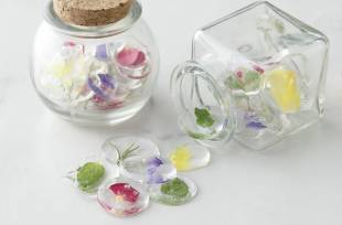 Inspired by traditional Japanese marbles, which are basically flattened spherical ones, these crystallized sugar drops replace the glass version's central swirls of color with dainty edible petals or herbs.