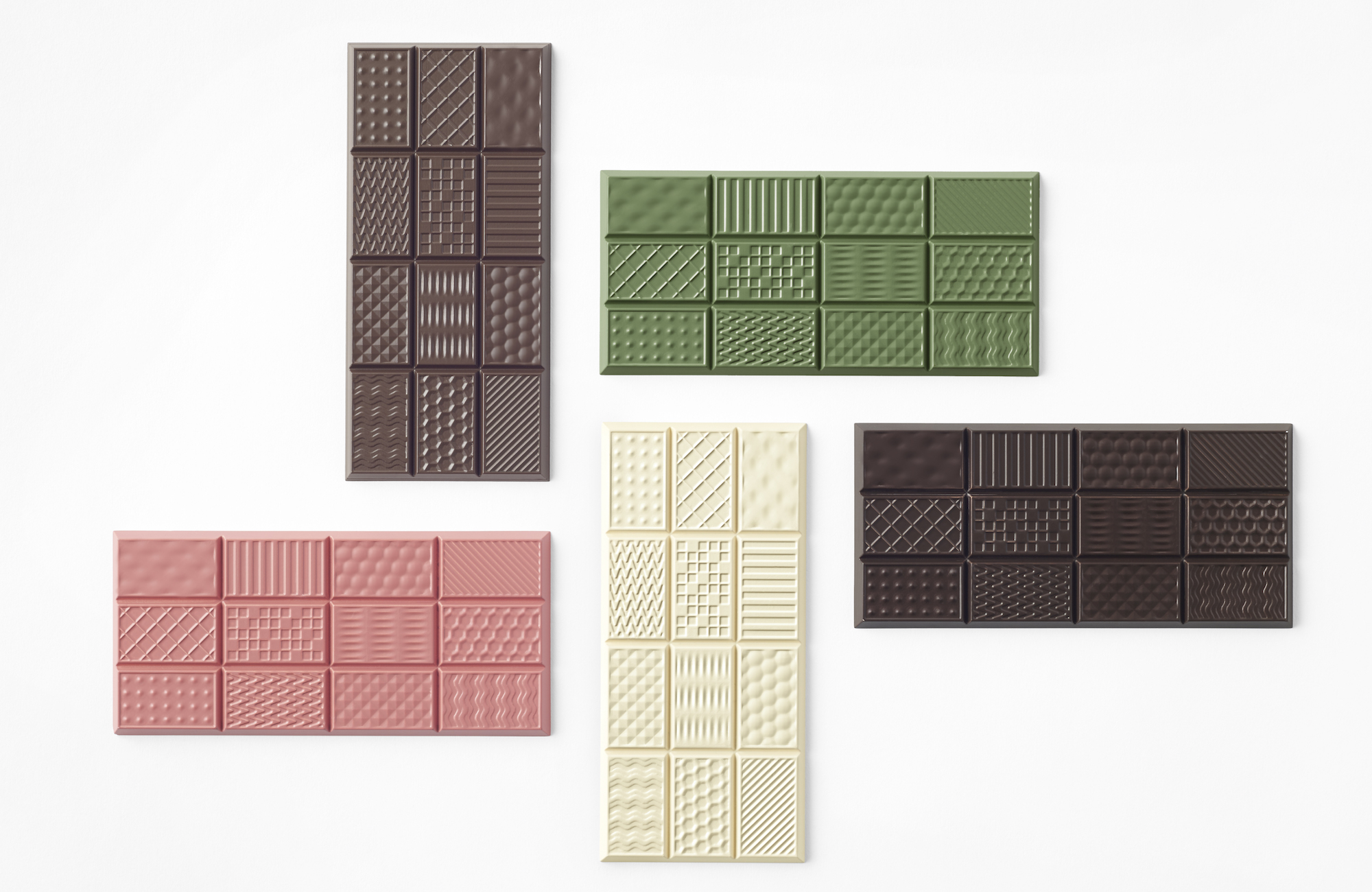 The bar, which is divided into 12 patterned panels, is based on the idea that rolling a piece of chocolate in the mouth and exploring texture with the tongue enhances the whole tasting experience. The 12 surface textures range from smooth undulating and dimples and lightly raised dots to well-defined zig zags and checks — all of which can be felt by the tongue during those melting moments of self-indulgence.