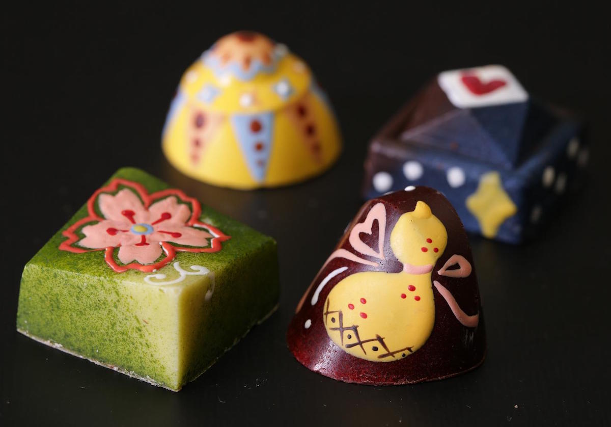 Each sheet is just two millimeters thick and every pattern, which includes pastel green bamboo leaves, pink cherry blossoms, kabuki masks and more, is of a different cacao percentage and flavor. A flock of orange and white flying cranes, for example, is 36 percent and blended with Madagascan vanilla, a scattering of gold flakes is 66 percent and has the fragrance of roast nuts, while purple geometric waves is 39 percent with hints of caramel and banana.