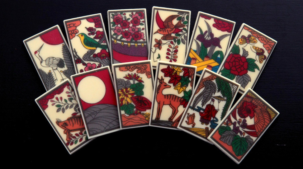 These beautiful chocolate slabs by Maqui’s Co. Ltd. are designed after the Japanese Edo Period (1603-1868) card game hanakaruta (flower cards, also known as hanafuda) — and their sugary illustrations are faithful to the real thing. Hanakaruta involves 12 suits, each representing a month of the year with a flower or animal motif printed in vibrant reds, pinks, greens, purples and oranges.