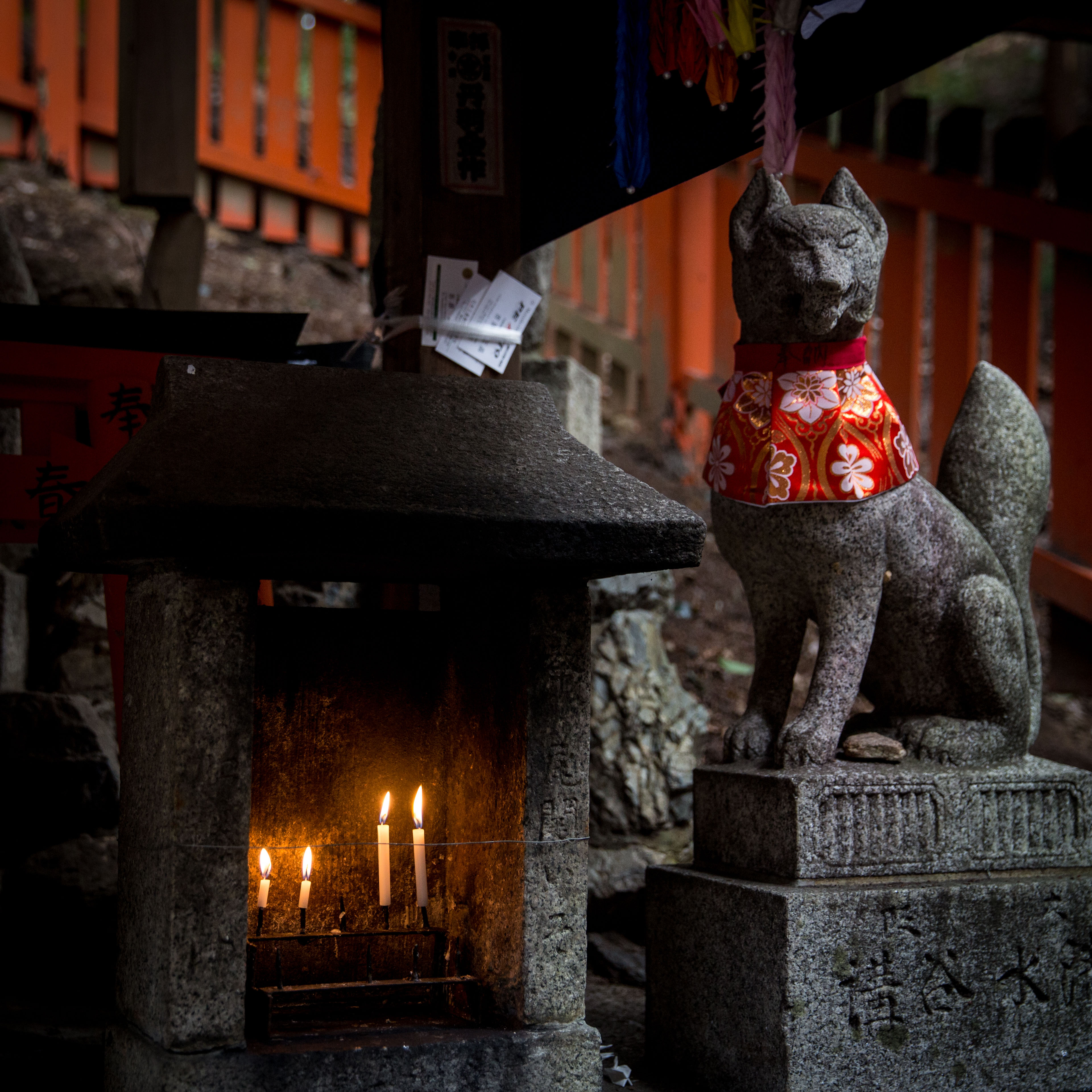 Moving along, we pass the two foxes in front of the shrine, each one with a key in its mouth. We enter the torii path that leads up to the inner shrine, a two-hour walk looping back through the cedar forest, passing graveyards and altars and the ubiquitous statues of foxes. We finally rest at a shaded pond, where old moss-covered graves adorn the shoreside like flowers.