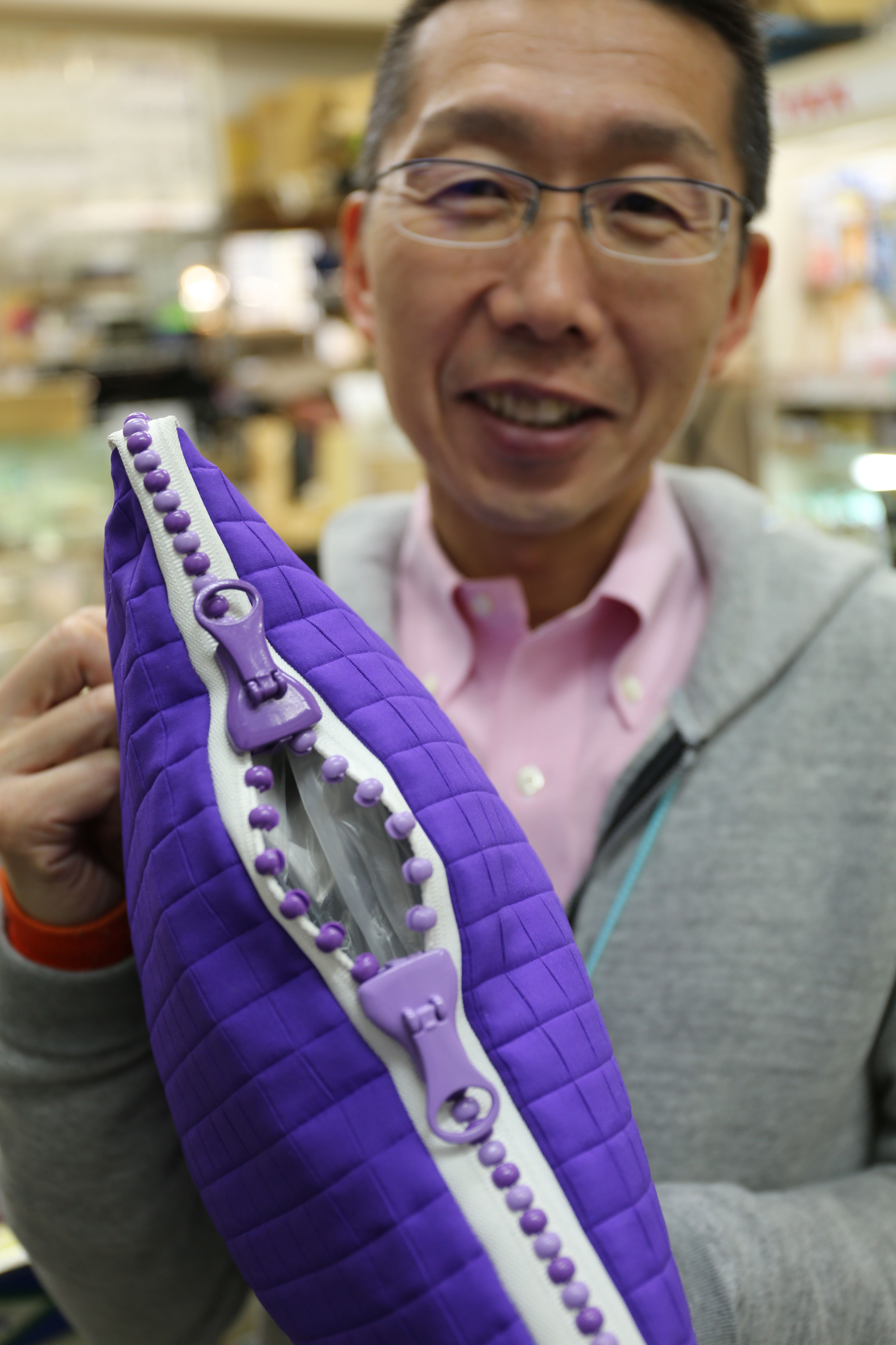 Kato, his name card dangling from a cute zipper lanyard, shows me the shop's two hit products. One is YKK's Excella line of finely toothed, polished zippers plated in precious metals. Very fly. The other is the polar opposite: a comically giant plastic bead zipper available in 580 color variations. K-Fastener also carries massive waterproof zippers used by commercial fishing nets, the shop's most expensive items. Thanking Kato for his "fasten-ating" explanations, I move on.