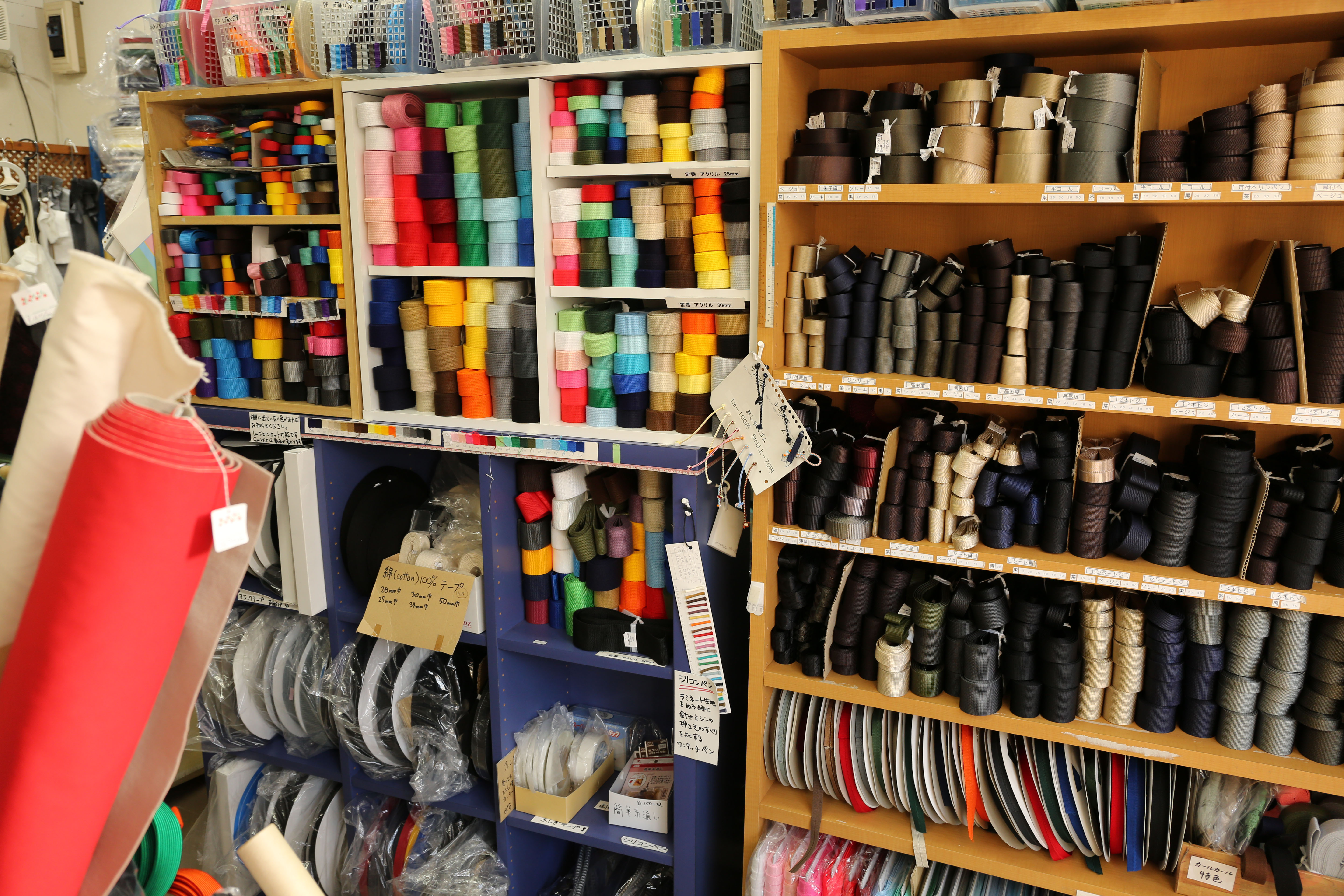 Next door, I note that Tokyo Vinyl sells straps — Japanese call them "tapes" — in all sizes, colors, widths and materials, as well as rolls of designer fabrics.