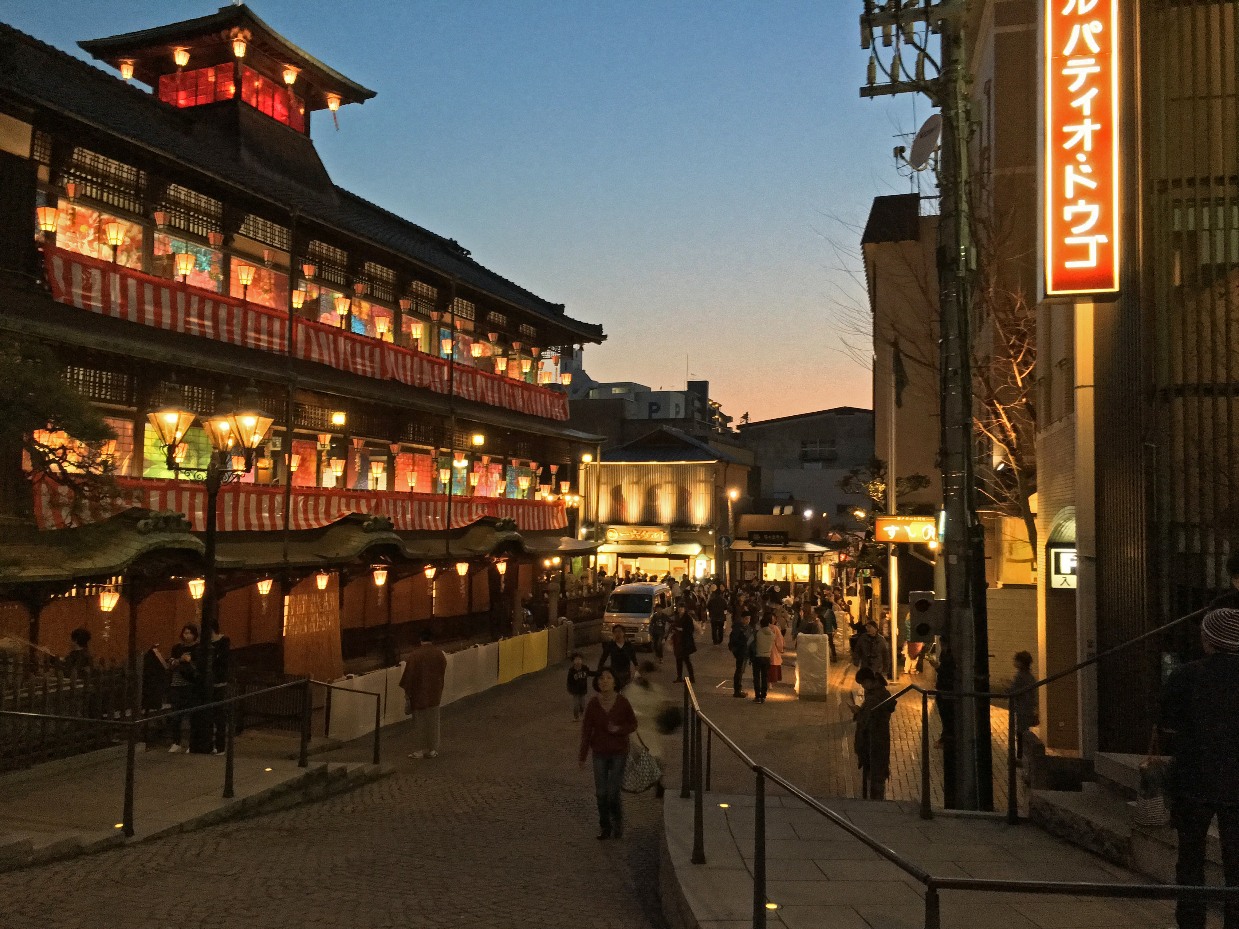 The line outside Dogo Onsen Honkan is very long (arrive early if you want to get in), so our group heads to the nearby Yamatoya Honten Hotel as an alternative. After a quick soak we gather at the hotel's noh stage to catch a short show by the establishment's owner, lit by torches and under a moonlit navy blue sky. I find myself trying to find words for the colors, the surroundings — after two days of watching the group recording their trip through poetic turns of phrase, I find myself doing the same thing. Haiku is contagious.
