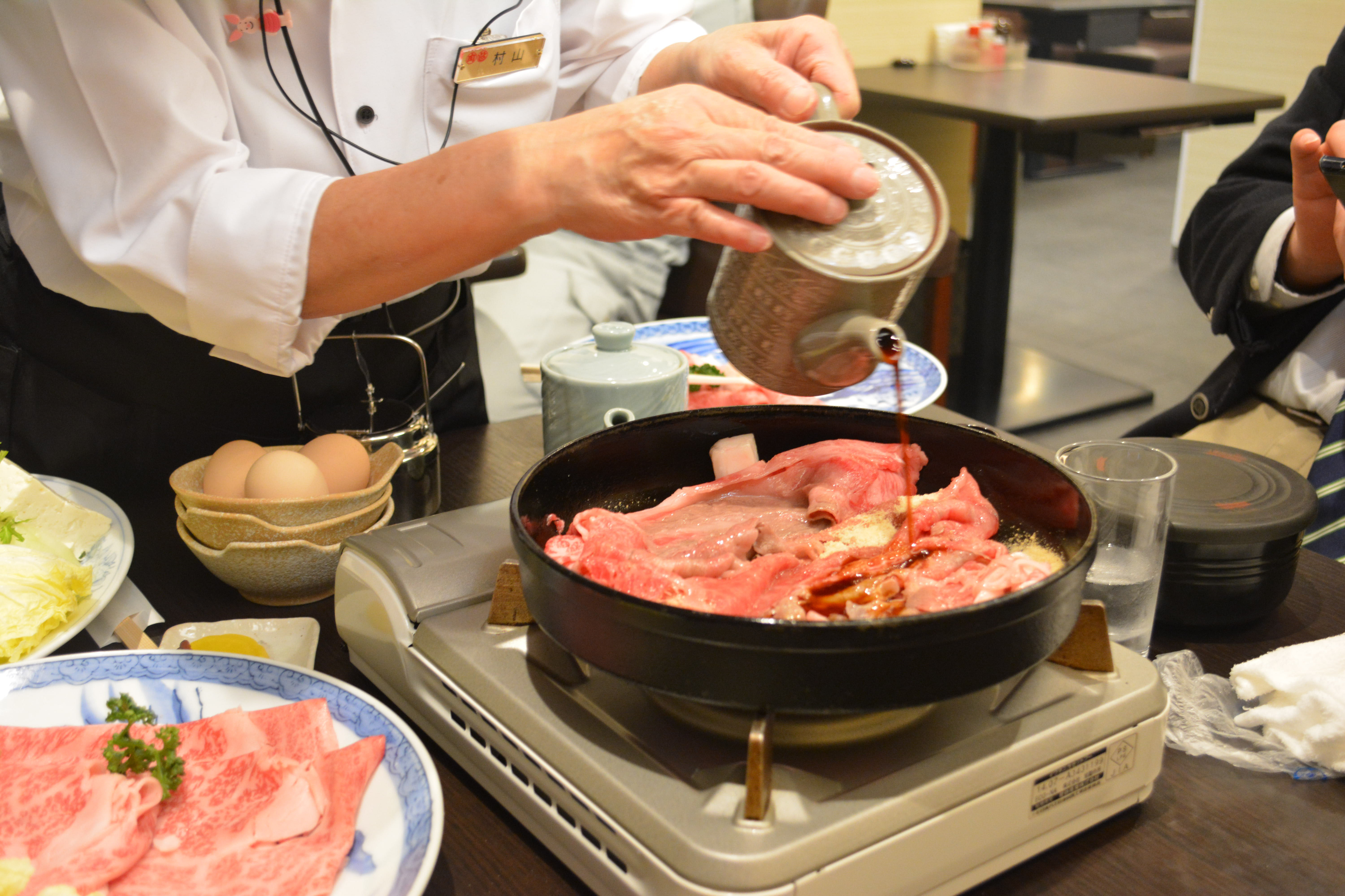 Hikaru Hirohara, owner and president of Maruyoshi, joins me as I prepare to sample a serving of Matsusaka beef sukiyaki.