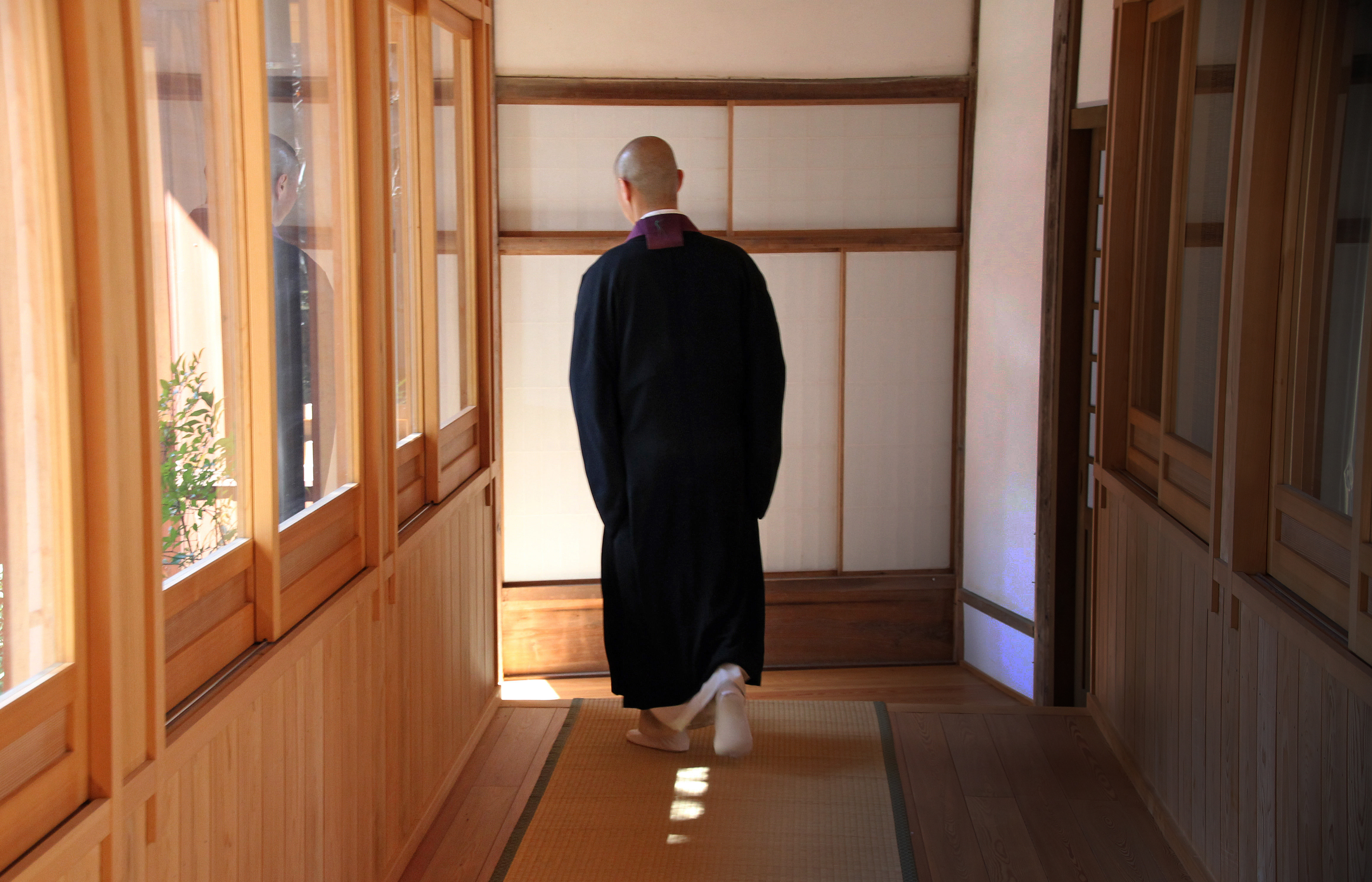 Wearing traditional black-and-gray robes with white-socked feet, the head monk, Kouhaku Nakai, greets me and leads me further into the temple. We pass through an enclosed glass corridor and a Zen garden, before entering the sodo (monk's meditation hall), which was built in the style of a 13th-century Chinese Zazendo hall.