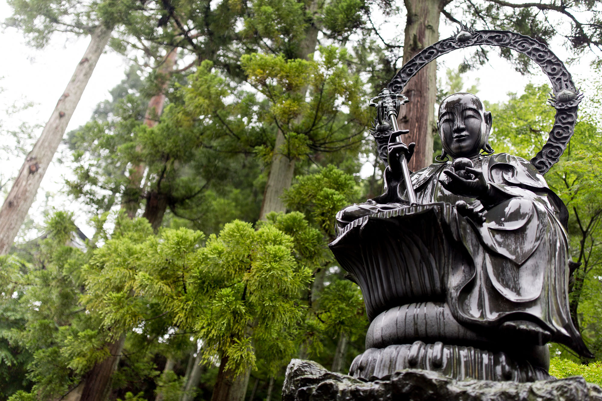 The temple ground is suffused with a sense of peace, housing the dead in serenity. In the rain, we walk through a grove of cedars, past mossy memorial stones and hydrangeas in wet bloom. Drops of silver pearl down the tips of the cedars; the rain ripples a pond with sea roses.