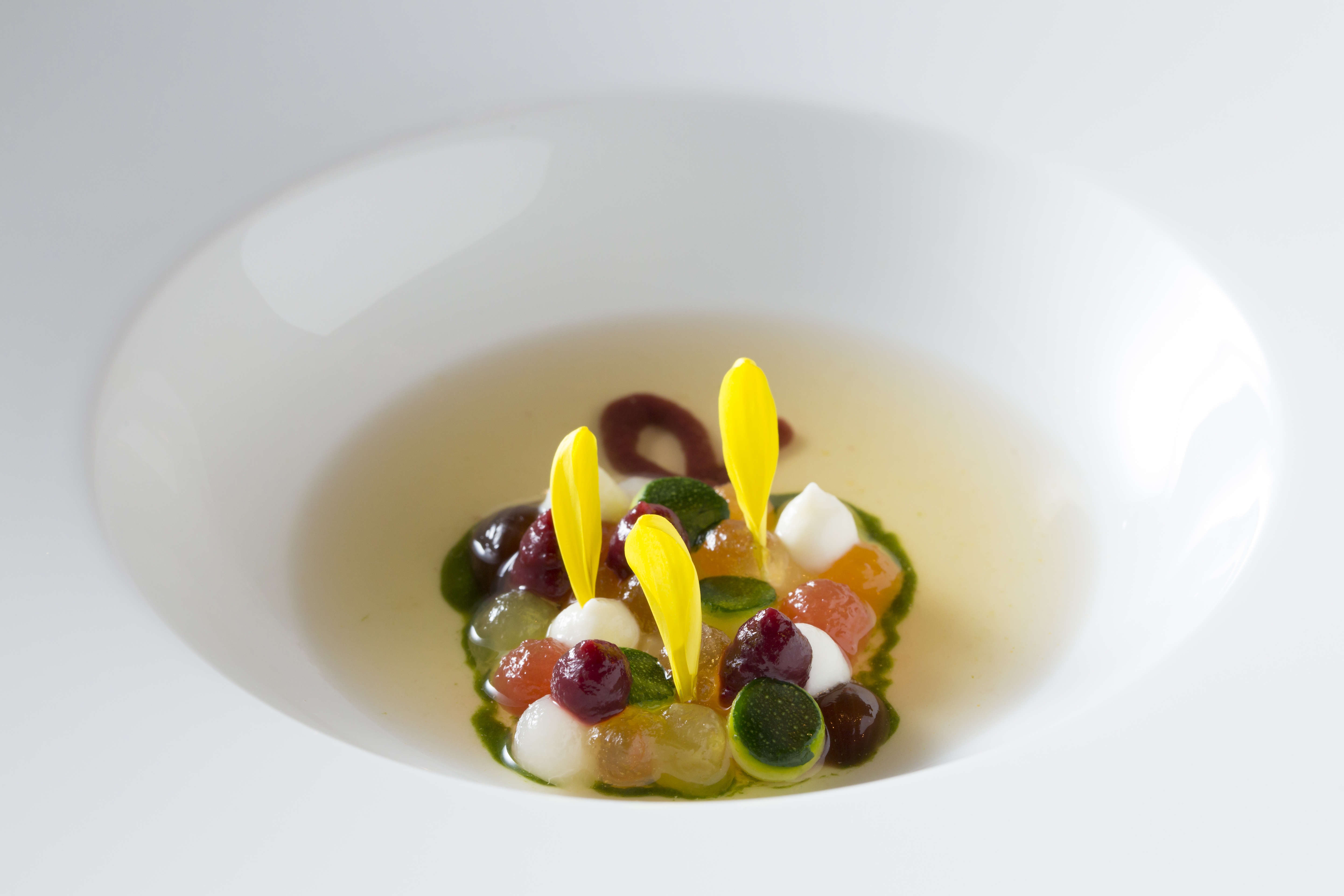 Both the five-course lunch and seven-course dinner (plus nibbles at the beginning and end) comprised dishes from Bottura's most recent repertoire. Some featured intensely vivid splashes of color; others were daring, almost provocative monochromes. All were memorable and, most essentially, unfailingly delicious.