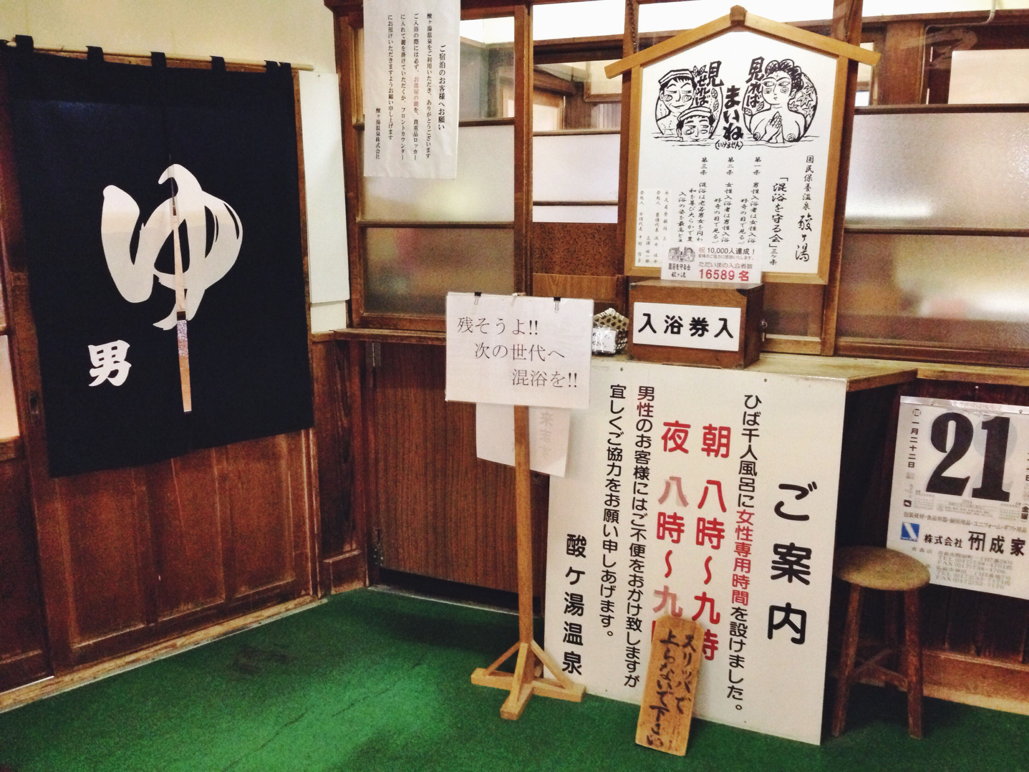 Although Fudo no Yu ended up reopening a couple of months later, any opportunity for licentiousness has been strictly curtailed. While it's still mixed, an attendant is now present during opening hours, and women — not men — are required to wear a towel, or yugi, a special bathing suit.