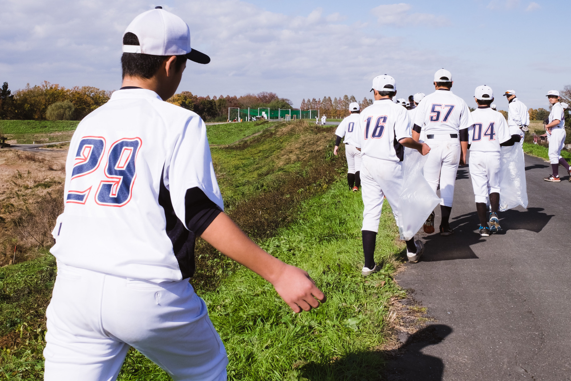 Walking along the Arakawa in Saitama on a Sunday morning, I see a young baseball team carrying plastic bags and picking up trash they find as they wander in the opposite direction. I approach the coach and ask if they're being punished. He laughs.