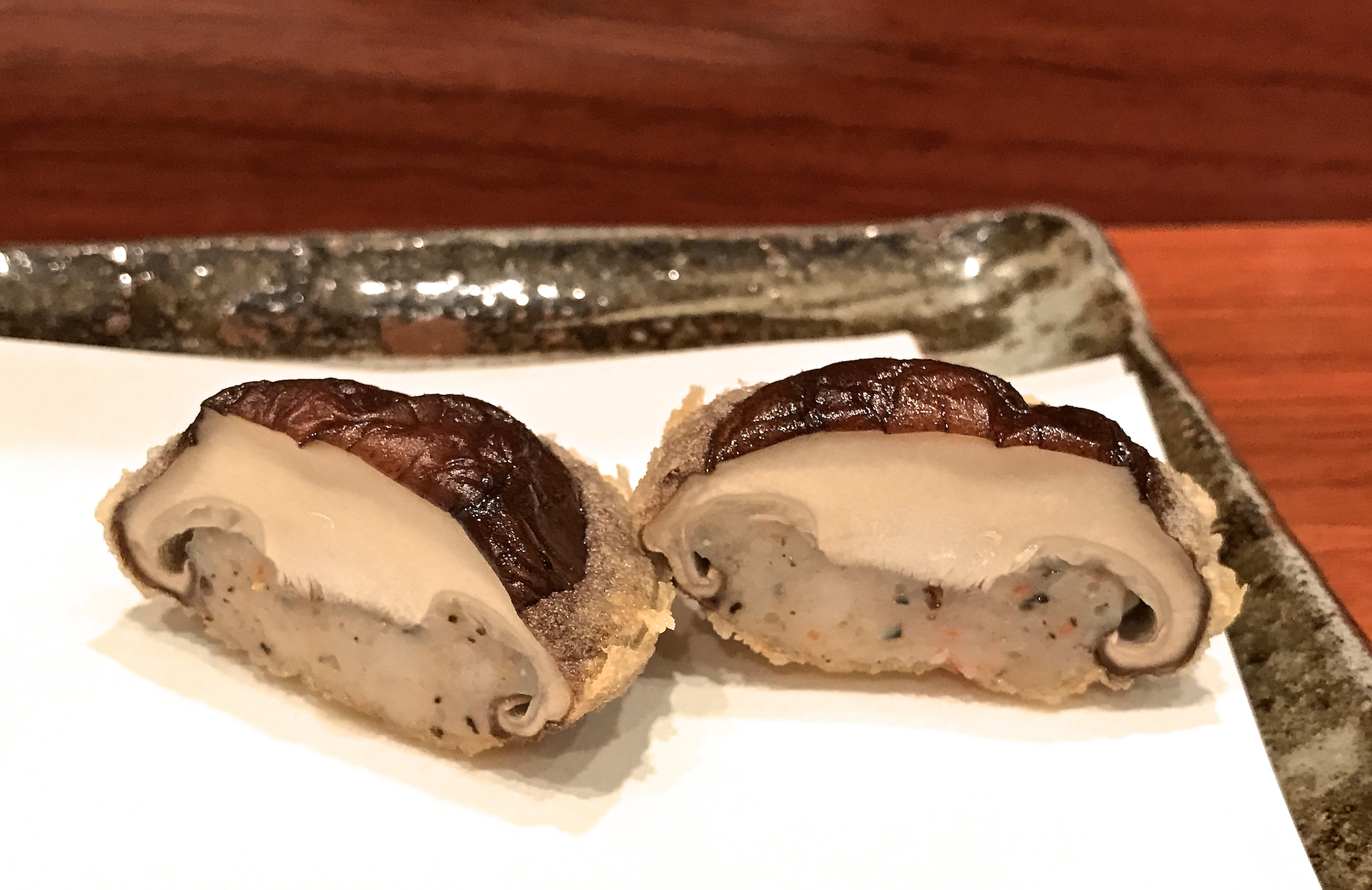 The opening item is always kuruma ebi (king prawn). However, Yokota presents you with the legs first, encased in delicate, crunchy batter, followed by the juicy, tender body of the prawn. All the classic ingredients are present and correct, from kisu (Japanese whiting) and plump, juicy scallops to fresh shiitake mushrooms stuffed with shrimp paste and delicate little eggplants sliced in two lengthwise.