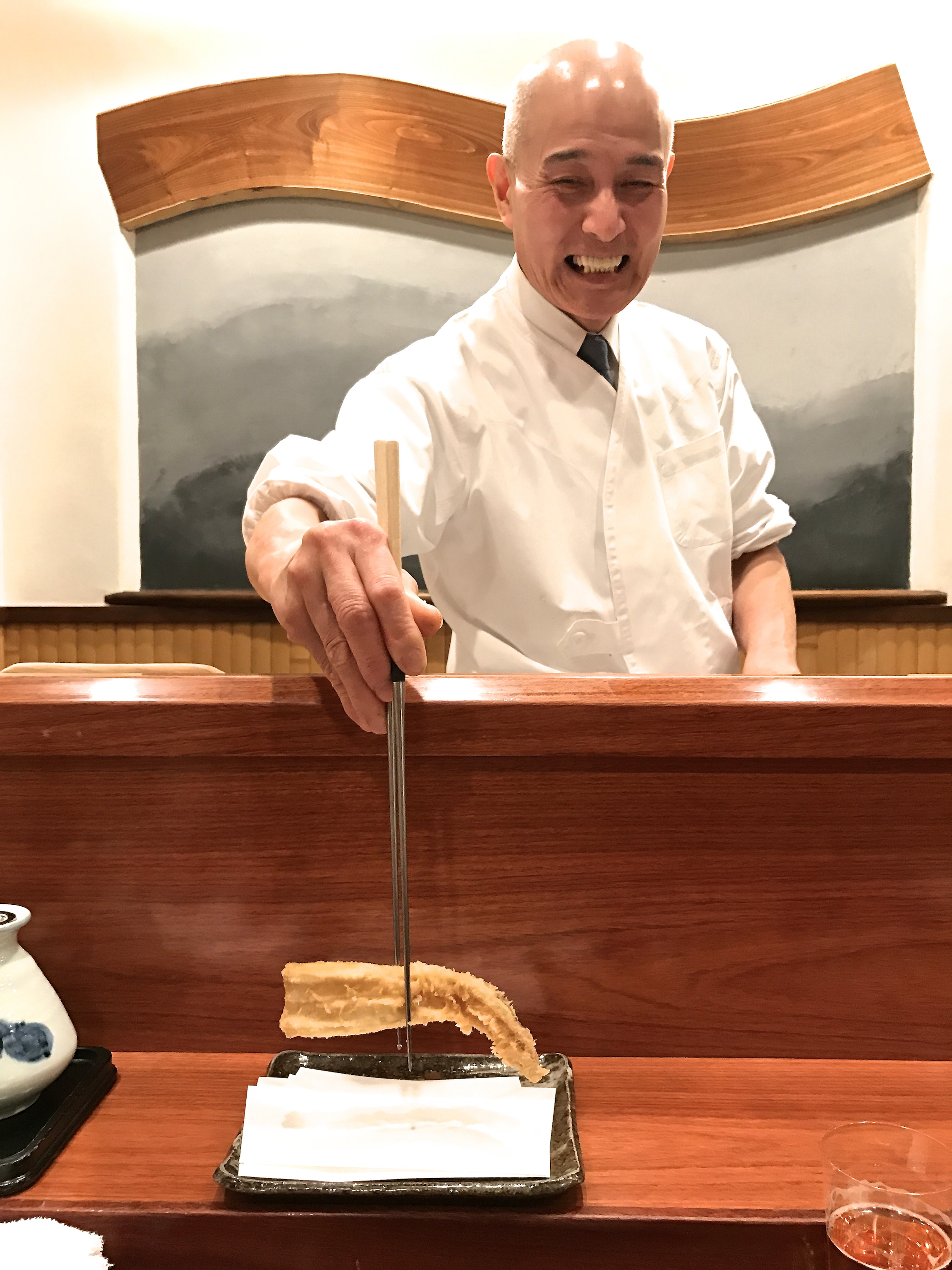 At this time of year you can expect bamboo shoot, hinting at the spring that is around the corner, as well as little skewers of ginkgo nuts from the autumn that is now well behind us. And whatever the season, there will be anago (conger eel). This is one of his classic preparations, with a superb contrast of textures between the crisp batter and soft white flesh.