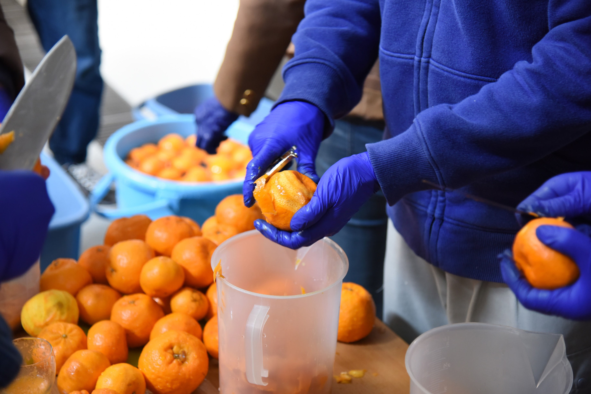 Near the brew system, 25 kilograms of ponkan, sourced from Ehime Prefecture, sit in two boxes, with knives, peelers and a juicer set up on a small table.