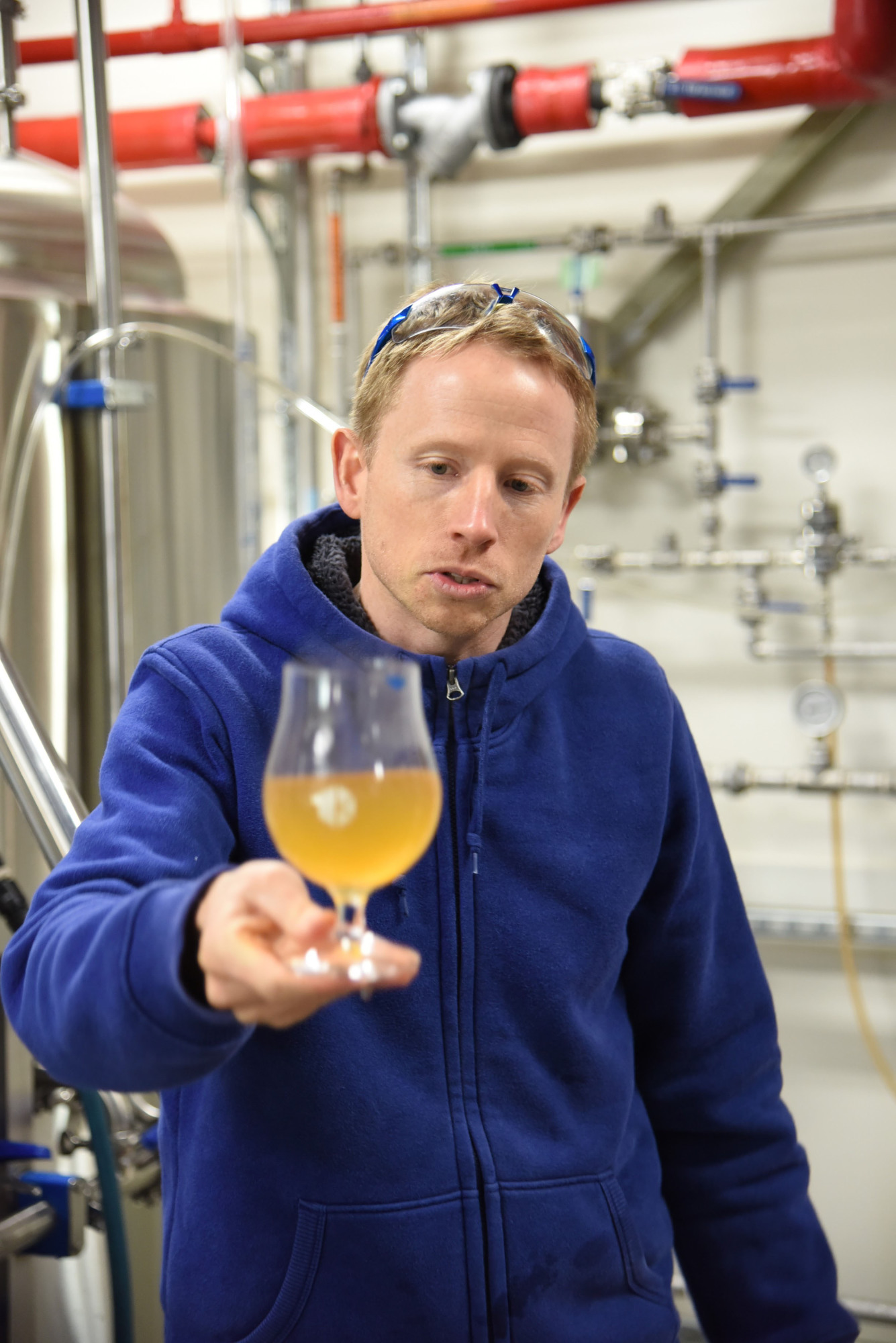 "I'm not a big fruit beer guy," Hainge says later. But the added element makes for a good collaboration, as a lot of preparation work is required on the brew day.