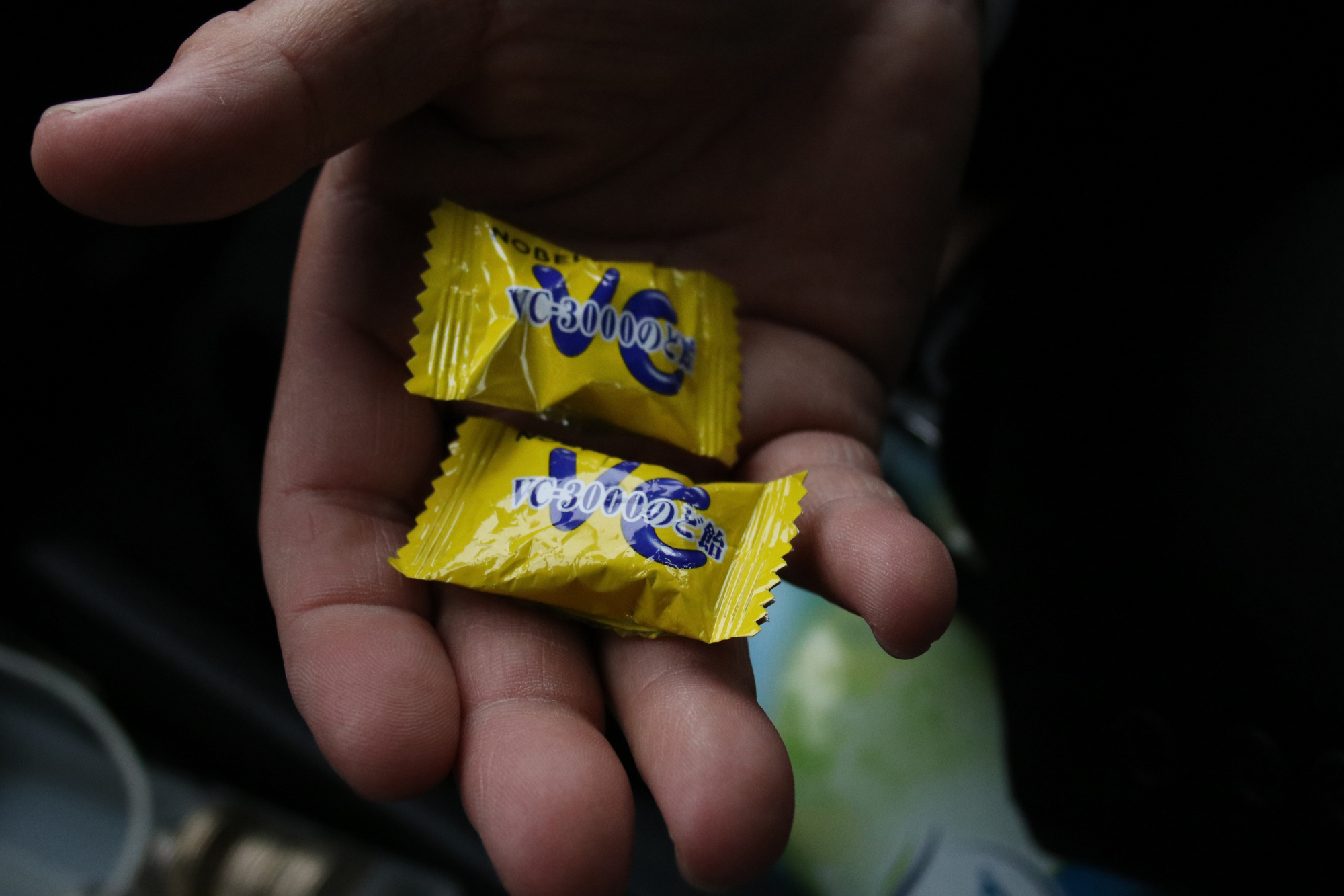 In Japan, merchants, airlines and cabs sometimes offer baskets of free treats, but personally vetted health-conscious ones? That's a first. I take one — a lemon-flavored "Nobel VC-3000" — and give it a try as the driver expertly slaloms through traffic. At the first red light, I catch his eyes in the rear-view mirror. "This candy's not bad," I say, "but your driving's superb."