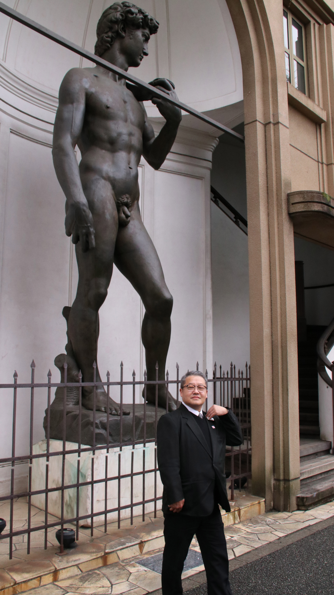 After our short break, I learn that Kato has a passion for fashion. He's a natty dresser, with a nice watch and Tom Ford eyeglasses. In fact, he has a collector's case full of the iconic designer's eyewear with him, in lenses and frames that range from professorial horn-rims to Gangnam Style sunglasses. I ask Kato if I can grab a photo of him outside of his cab, and he strolls over to a nearby replica of Michelangelo's David, where he strikes a similar pose. When Kato confides that he has a Catholic name, Bartholomew, and has converted to the faith, his portrait with the biblical hero seems a little less random.