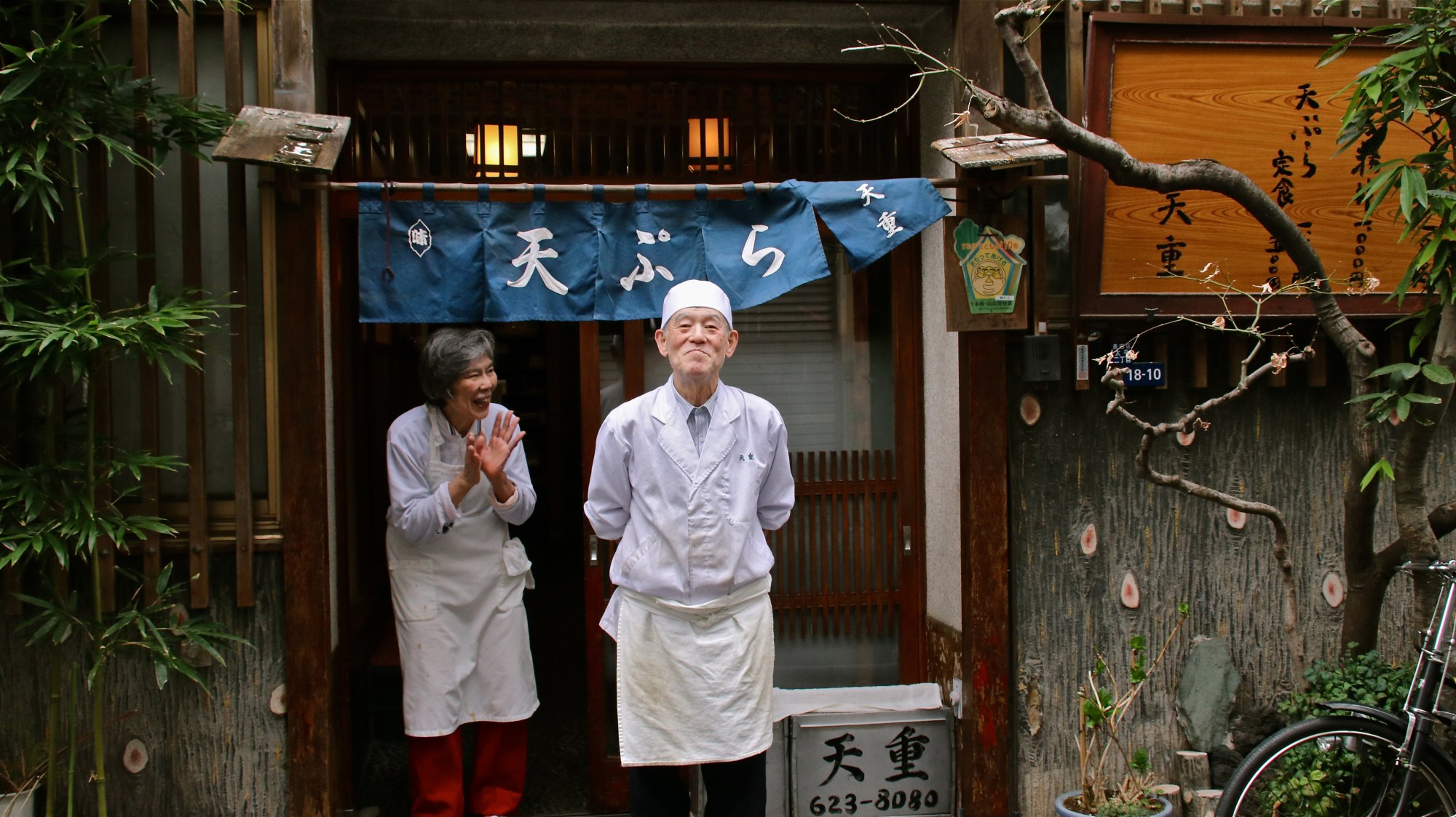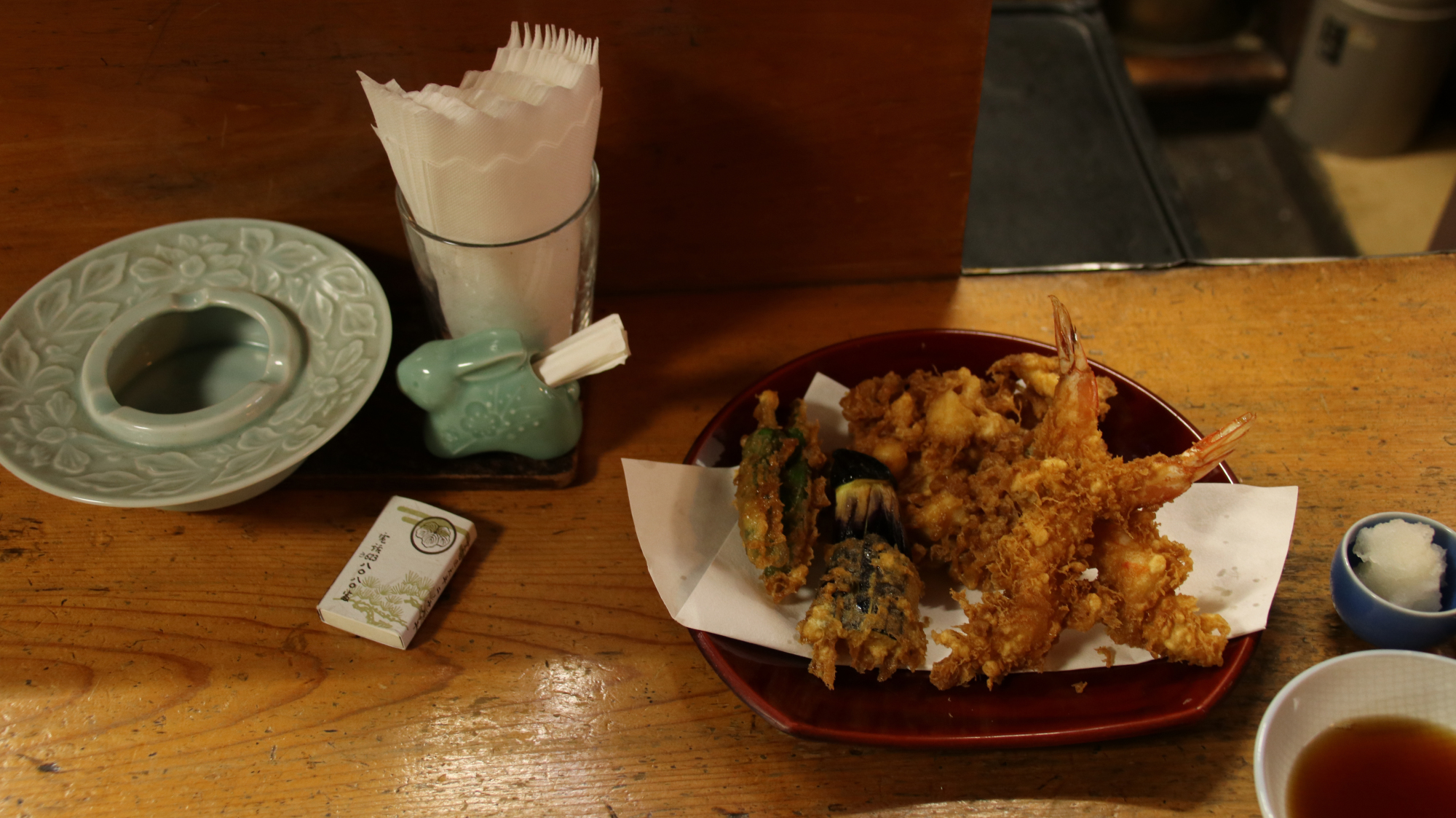 Inside, the place has the seating capacity of about two taxis. We pull up stools at the counter, tidily managed by a sweet elderly couple, and order lunch sets from the basic menu painted on wooden slats and strips of paper. In a copper pot, shop master Shige-san prepares Shitamachi-style tempura — ingredients sizzled in sesame-flavored oil, then dipped in sauce — as I admire the nostalgic aqua-colored ceramic ashtray and toothpick holder, a book of matches bearing a seven-digit phone number and a fat goldfish navigating a glass bowl. Before my tempura arrives, Kato has folded my chopstick wrapper into a little holder for the sticks, and before we have finished the delicious meal, he has paid the bill.