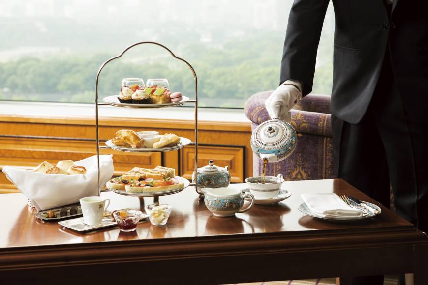 Imperial Lounge Aqua offers British afternoon tea comprised of ingredients from Britain for ¥4,860. On Sept. 5 and 19 and Oct. 10 and 24, a formal afternoon tea served by a butler on fine Wedgwood porcelains is available by reservation for ¥8,500.