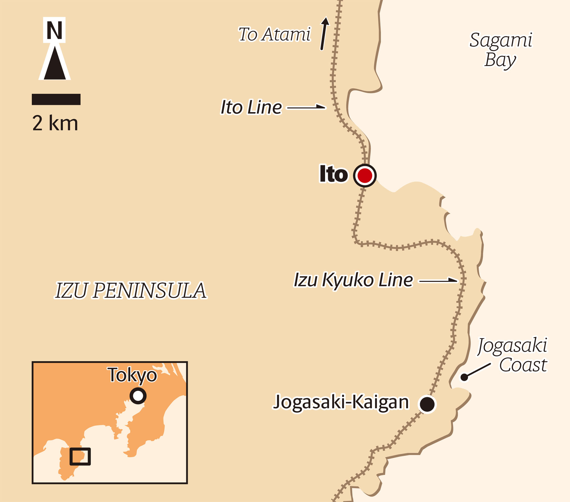Ito is easily accessible by train from Tokyo. Direct trains between Tokyo and Ito Station leave once an hour and take 100 minutes (¥4,500/one way). Local trains from Atami Station to Ito Station take just 20 minutes (¥320/one way). Local buses and trains can be used to navigate the Ito area. The Izu Kyuko train line runs down the Jogasaki Coast between Ito Station and Izukyu Shimoda Station and provides access to the southern part of the Izu Peninsula.