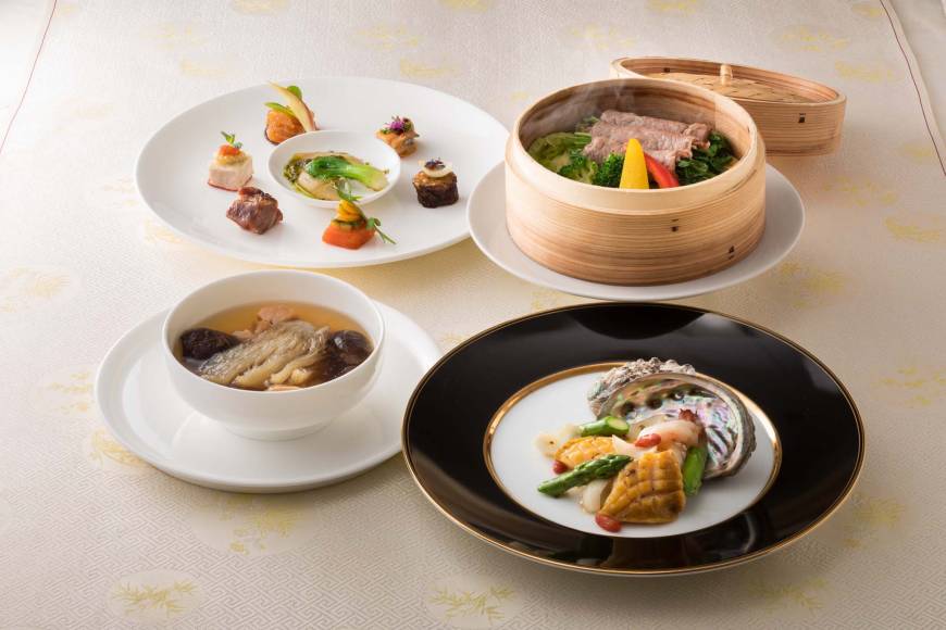 The dinner courses are available for ¥16,500 or ¥19,500. Steamed pea sprouts wrapped in strips of kuroge (black-haired) wagyu from Sendai are included in both courses. Shark fin and sea cucumber soup originating from the prefecture's coastal areas is also served in both courses. Prices include tax and service fee.