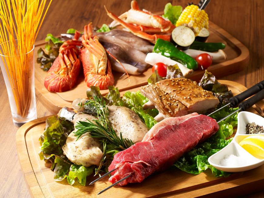 The Enjoy Wild Barbecue plan, available for ¥8,500, includes an Australian beef sirloin brochette, lobster, skewered vegetables, as well as chicken, pork, crab, squid stuffed with pilaf and fried pasta. Additionally, the Summer Colorful Barbecue (¥6,000) is available only for groups of women (up to 50 sets per day). It consists of an appetizer, oil fondue of vegetables with cream sauce, baked pasta with Neapolitan beef sauce, and sorbet for dessert in addition to seafood and fried pasta.