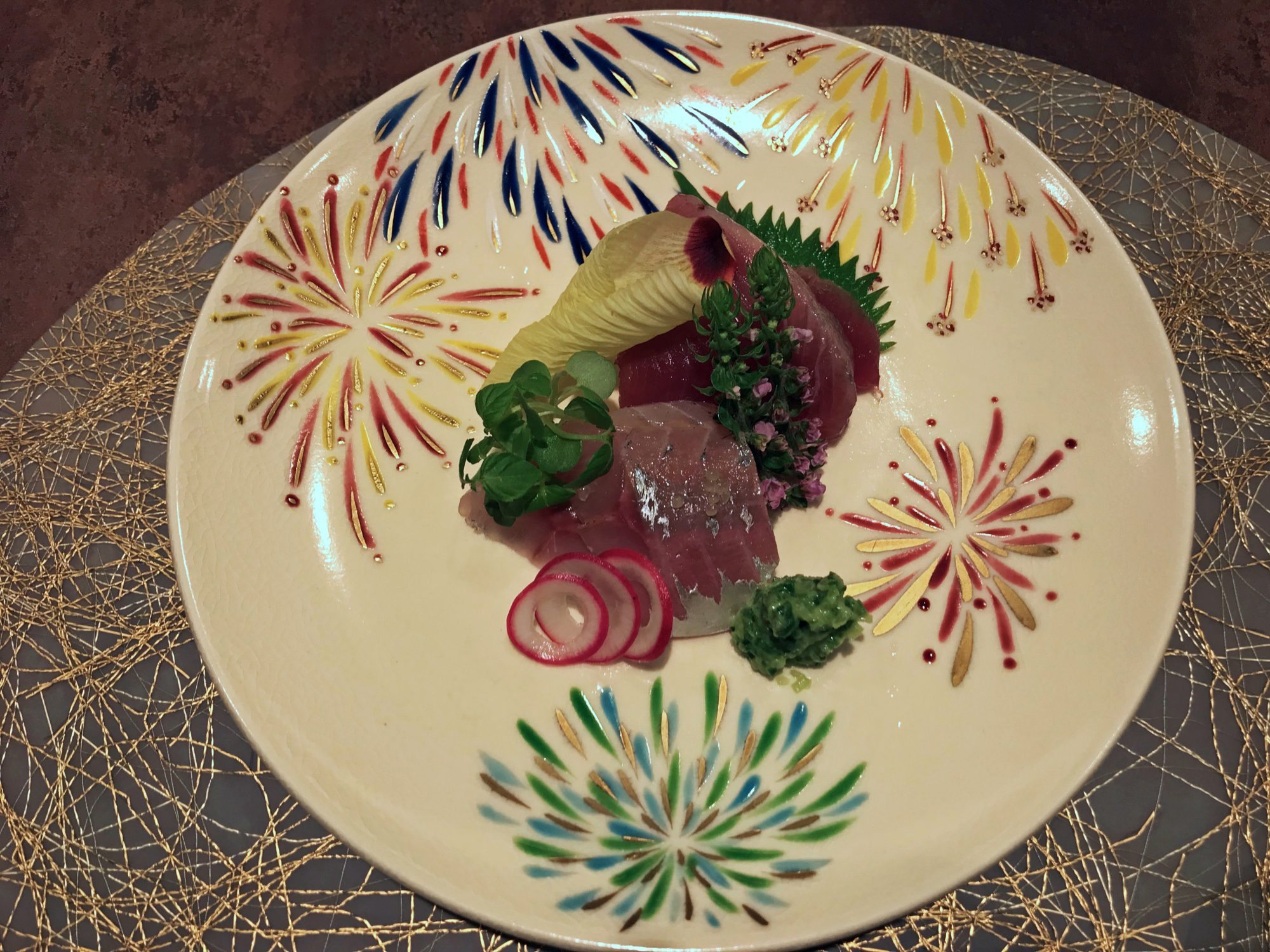He decorated the dish — colored by a motif of fireworks — with hana sanshō (pepper flowers) and a pale yellow okra leaf; edible fireworks atop painted ones.