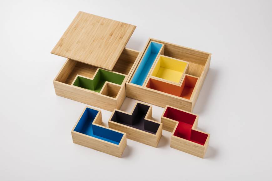 Perhaps some of the lineup's best interpretations of the iconic Tetris tiles are those found in the Kyoto-based bamboo-wood artisans' bento lunch boxes (¥20,520-¥30,240) and jūbako tiered boxes (pictured, made to order from ¥108,000). Here, the seven tetrominoes have been turned into interchangeable compartments that sport Tetris game colors — as highlights on natural wood on the bento-box and fully lining the jūbako ones. Designed to allow you to create combinations of sections to suit your needs, the boxes also retain a little bit of the puzzle element.