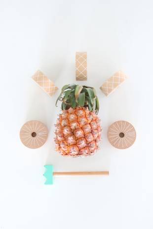 The Aloha Pineapple does away with daruma, who in the slightly garish traditional game usually looks angry at his impending fall. In place of his face is the top of a sliced pineapple, which makes the body of the stack. Available in natural wood or lemon yellow, the pineapple is beeswax polished, with its leafy head doubling as the hammer to play the game.
