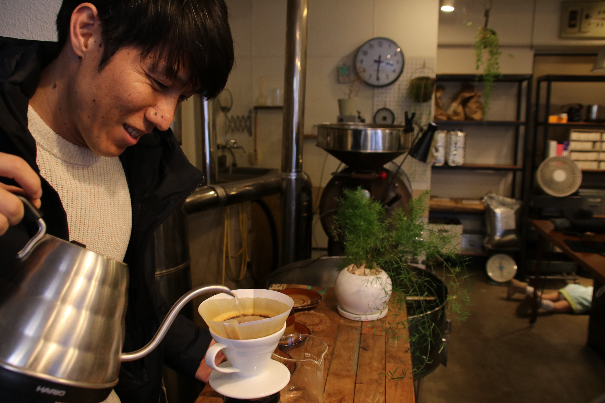 "I was extremely lucky," he says, "because the former owner of this coffee roastery, Mr. Hashimoto, decided to quit. I volunteered to work for free for a year, learning the trade, and then he gave me the machinery and space."