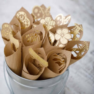 There are various Ishikawa-inspired designs, each accented in gold foil, ranging from a simple flower or butterfly to iconic structures, such as Kanazawa Station's Tsuzumimon gate and the stone lantern in Kenrokuen garden. There's also a plain one that you can draw on or write a message in as a card or gift. All are priced at ¥880 per pair and come with a flat-packed paper stand for when not in use.