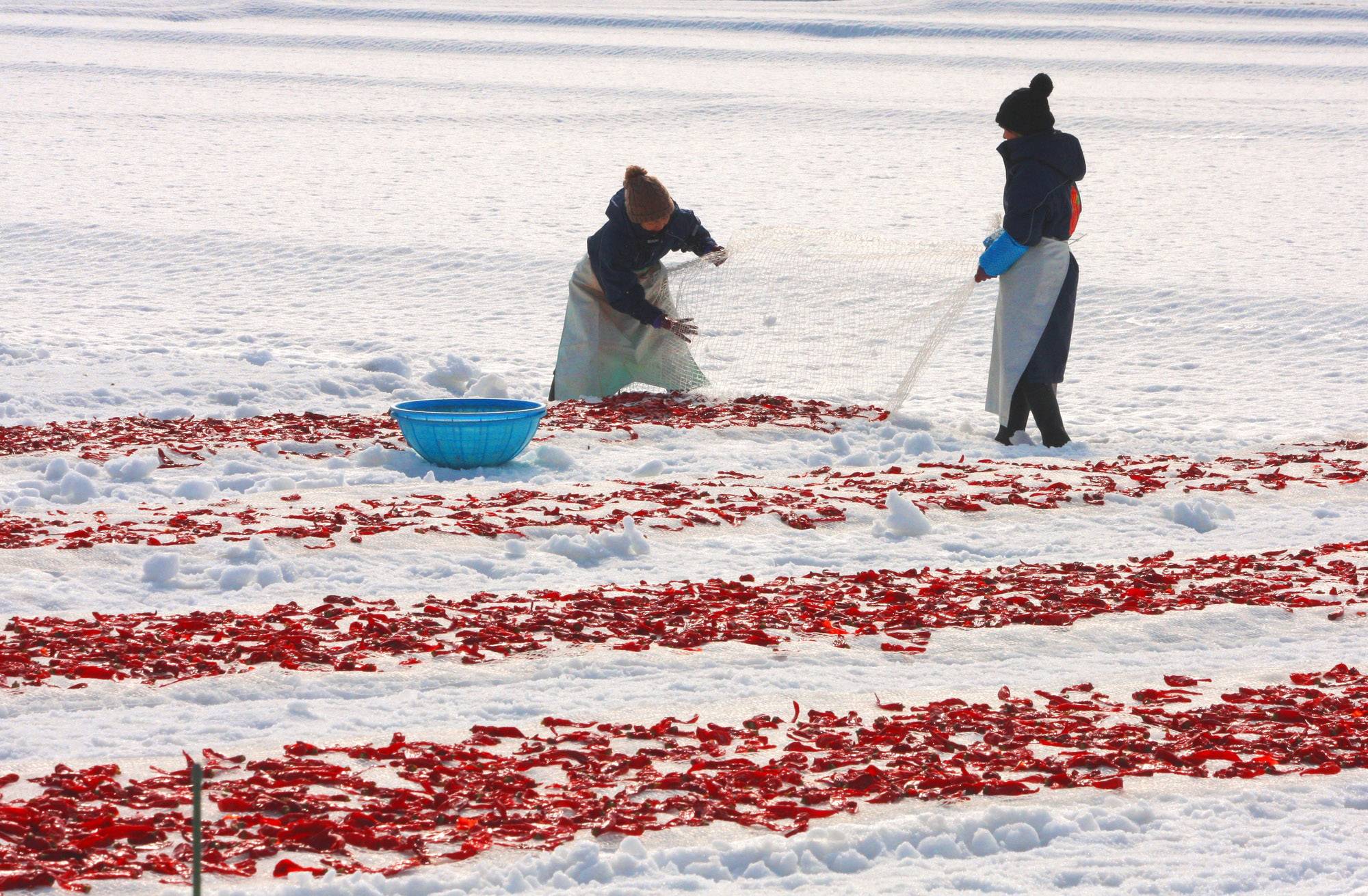 In the fall of the first year, the ripe, fiery red chili peppers are washed and pickled in salt. The following January, the chili peppers are desalinated and spread out on the snow, where they are allowed to freeze-dry. This process, called yuki-sarashi (“exposing to snow”), takes the edge off the chili peppers’ heat, while concentrating their sweetness and umami.