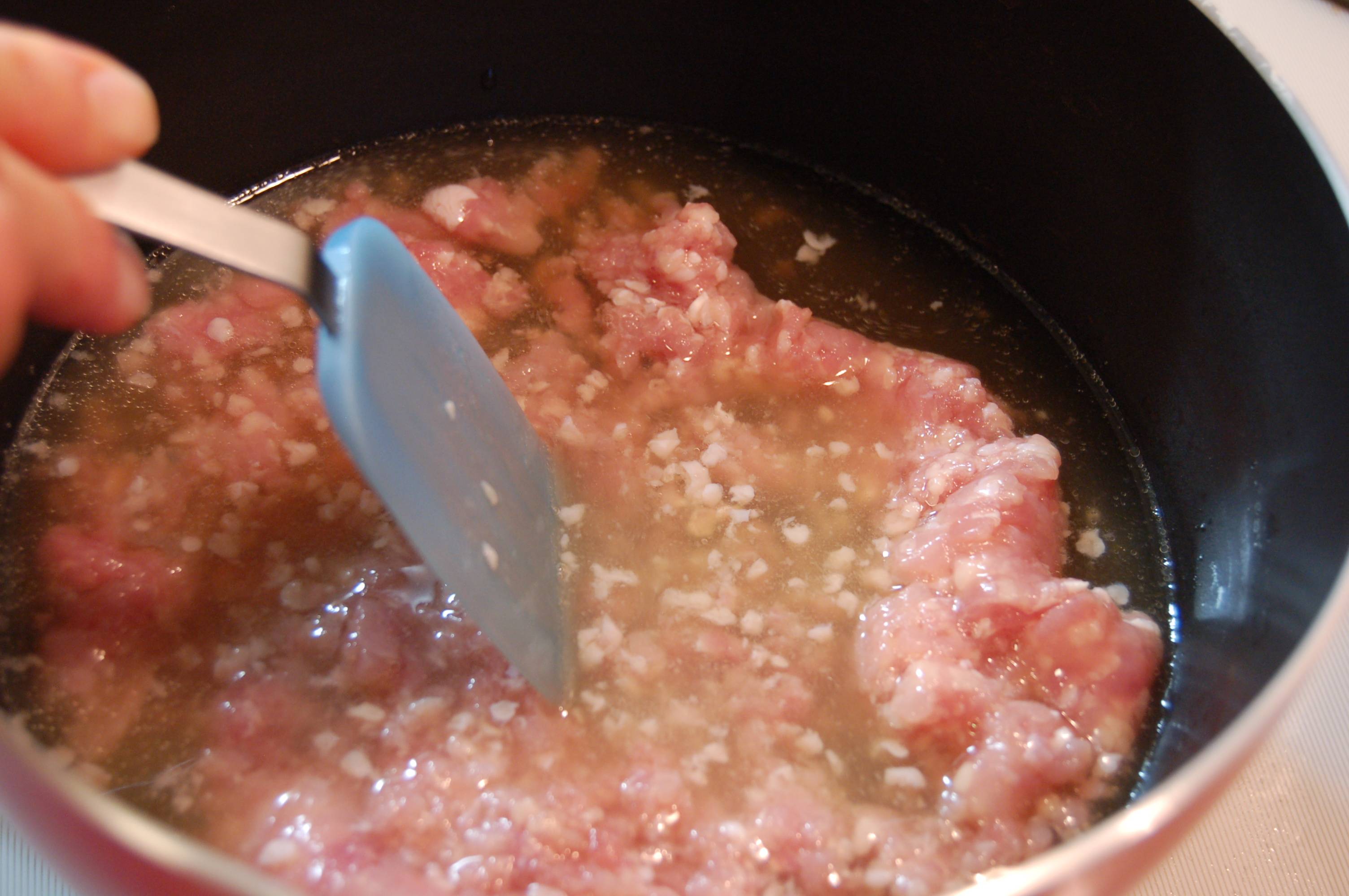 6. Transfer the tōgan pieces to serving dishes but don’t dispose of the liquid in the pot. Add the ground chicken to this liquid, stirring to break up lumps until it appears crumb-like. Place the pot over medium heat and stir to keep the ground chicken from clumping. Cook for two minutes or until the liquid is clear and the meat is white. Skim away any clouds of froth.