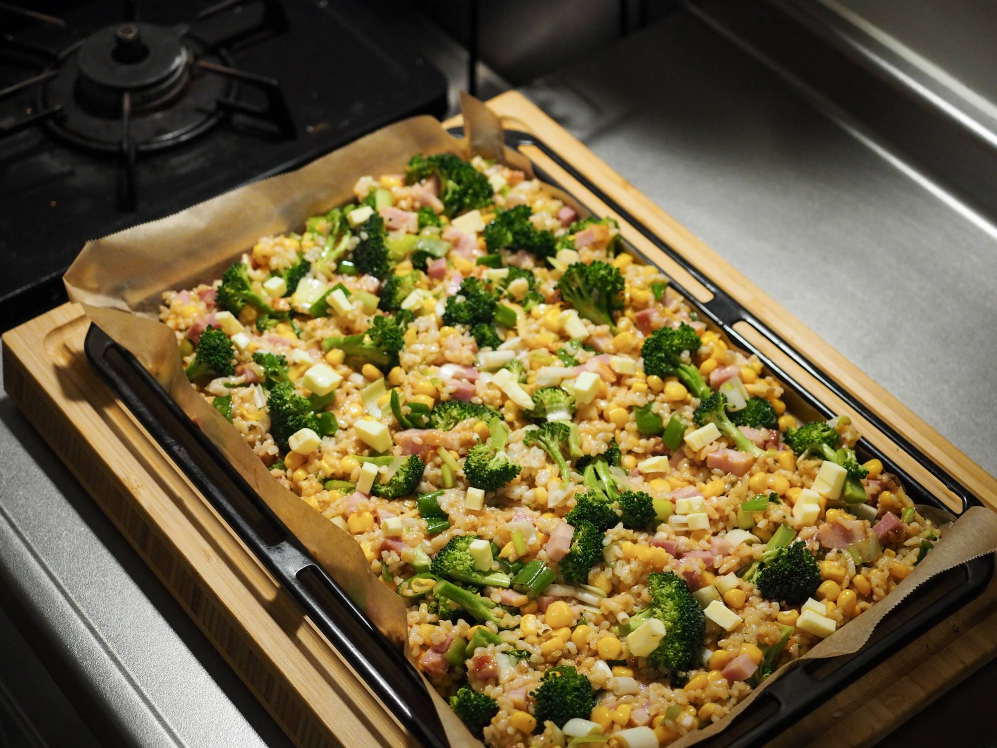 In ditching the skillet or wok for a baking tray, we increase the cooking surface area, which can produce more crispy edges, which for many are the best part of the dish. Baking your fried rice also takes the dish from being technique- and timing-intensive to almost foolproof. Baking does make the cooking process slower, but after some simple and speedy preparation, you’re free to focus on other dishes, wash up or just relax.