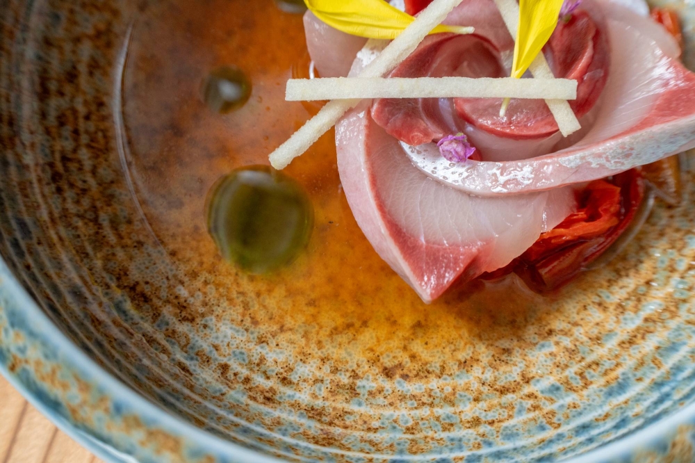 On a recent evening, I sample the three-glass wine pairing along with the 12-course chef’s tasting menu. At izakaya, starting with bubbles — specifically, a cold draft beer — is customary, but Konatsu puts a twist on this tradition with a glass of Domaine Gross Prelude 2020, a natural Cremant from Alsace. Crisp and refreshing with apple and citrus on the nose, the sparkler has enough body to pair with appetizers that range from palm-sized raw oysters drizzled with sanbaizu (a dressing of rice vinegar and soy sauce) to katsuo tataki (seared, rare bonito) sprinkled with marinated red onions and served with a smoky eggplant sauce.